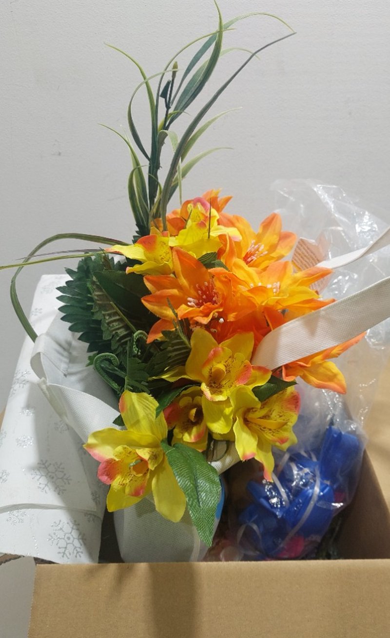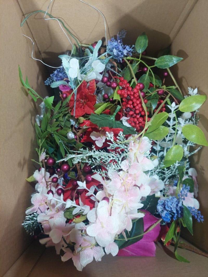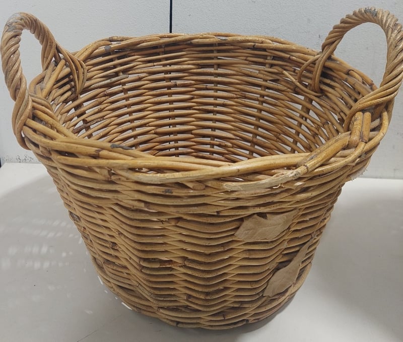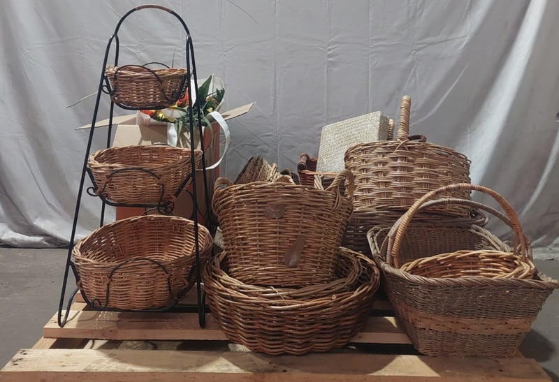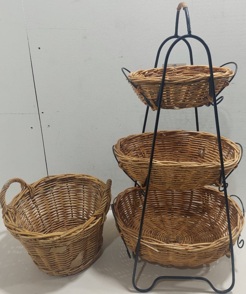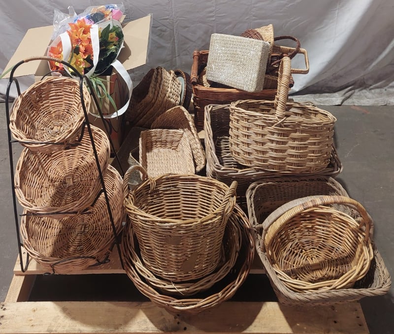Assorted wicker baskets and artifical flower.Sold as a lot.