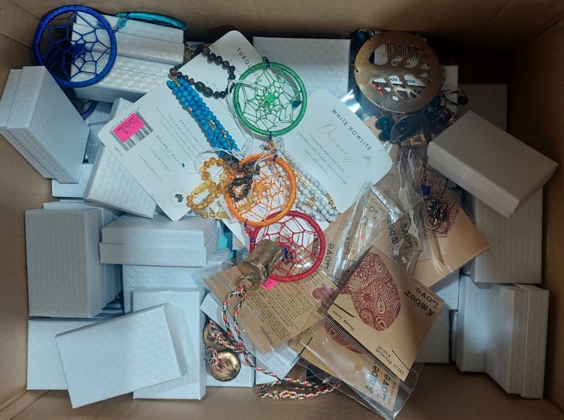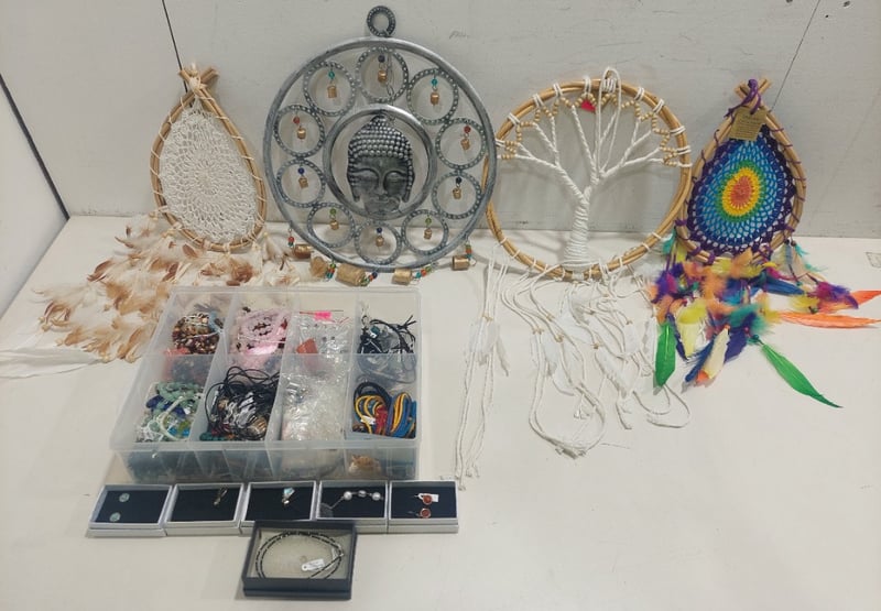 Assorted items including, dream catchers, mixedcrystal jewllery and more.Sold as a lot.