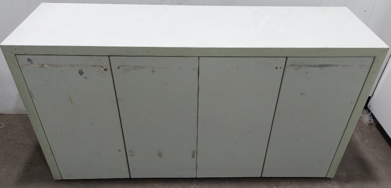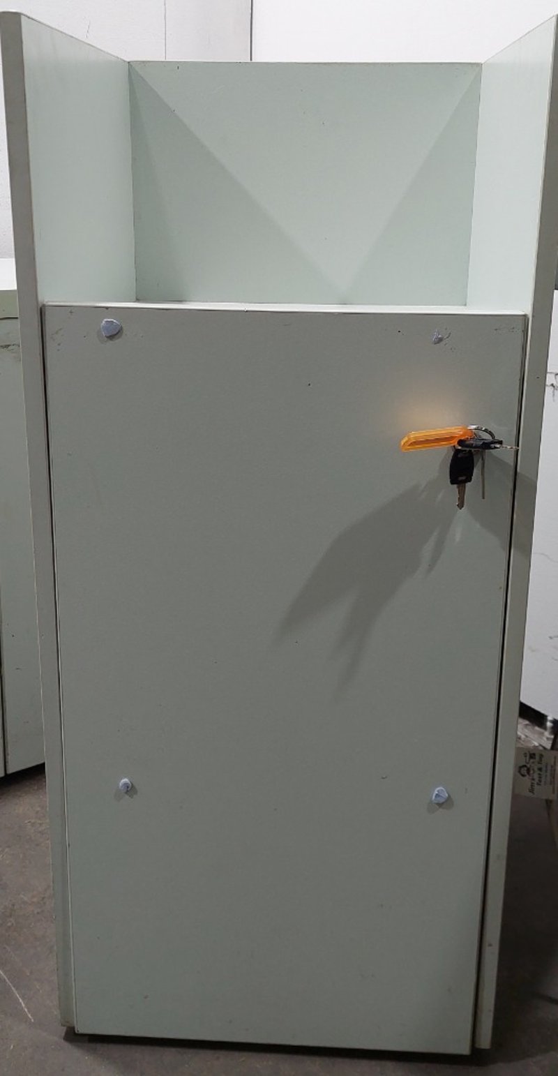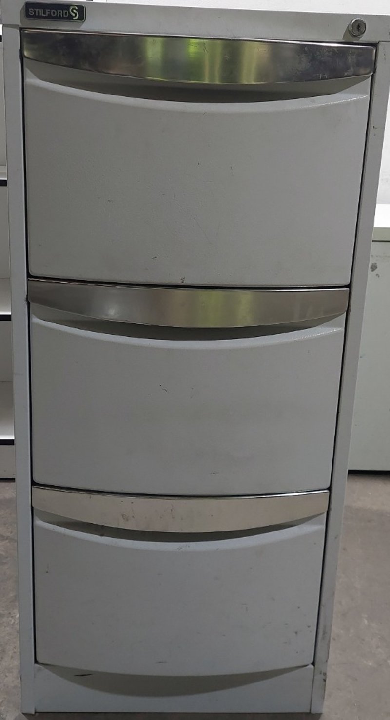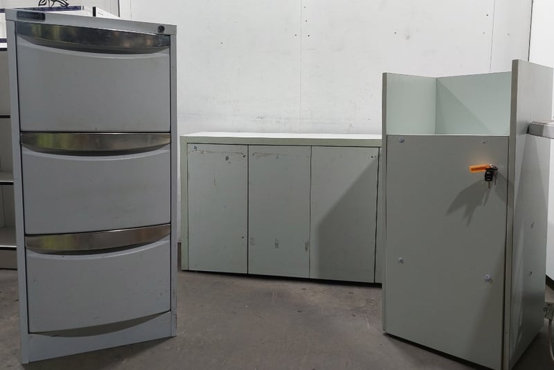 Assorted office furniture, including a metal mobile pedestal filing cabinet with three curved drawers and two other storage cabinets. Sold as a lot.