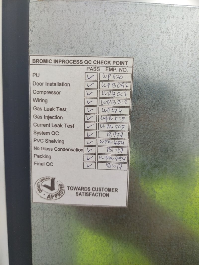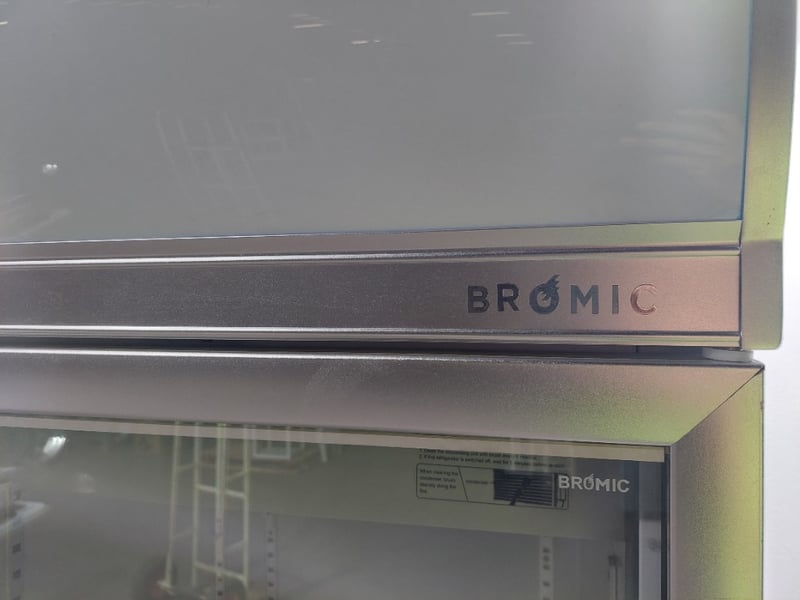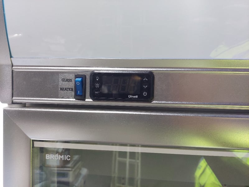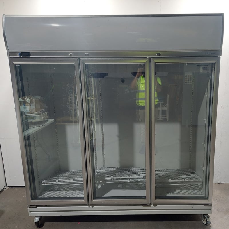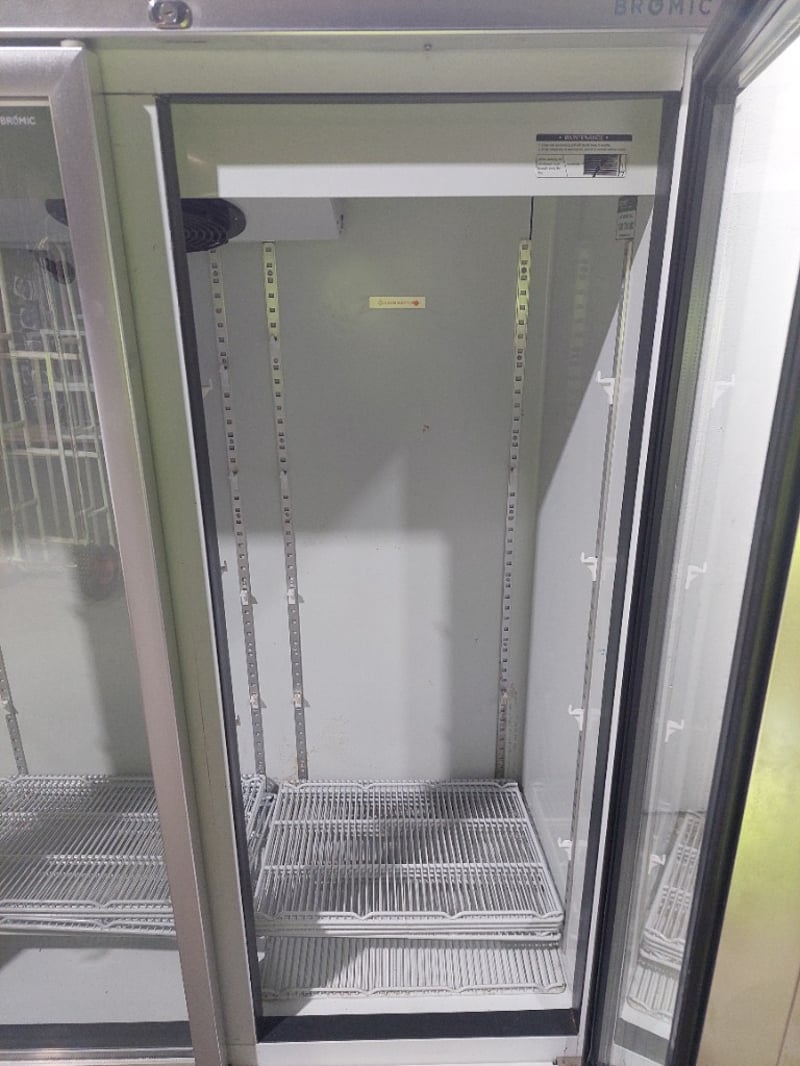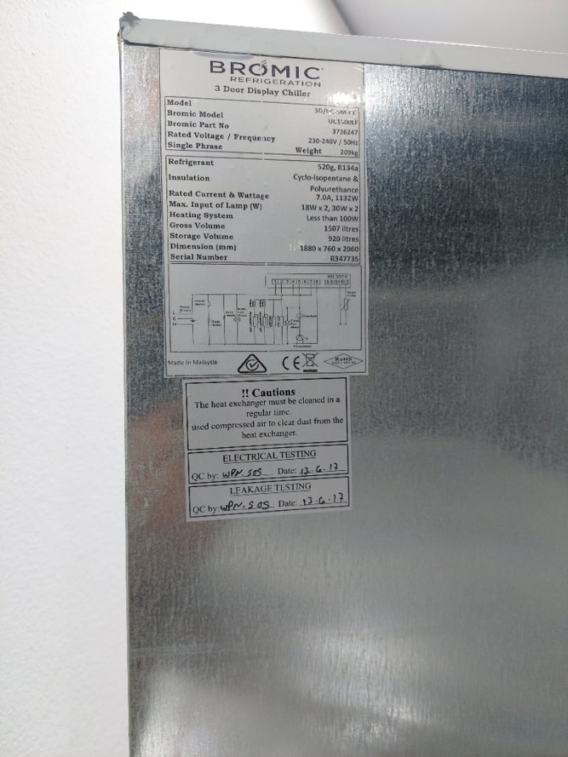 Bromic 3-glass door upright fridge – Description to use: Upright Display Refrigerator – Bromic UC1500LF, 3-glass doors, 1507L gross volume, 920L storage volume, self-contained, illuminated signage over, mobile, 1880mm x 760mm x 2060mm, S/N: R347735 Note : Untested