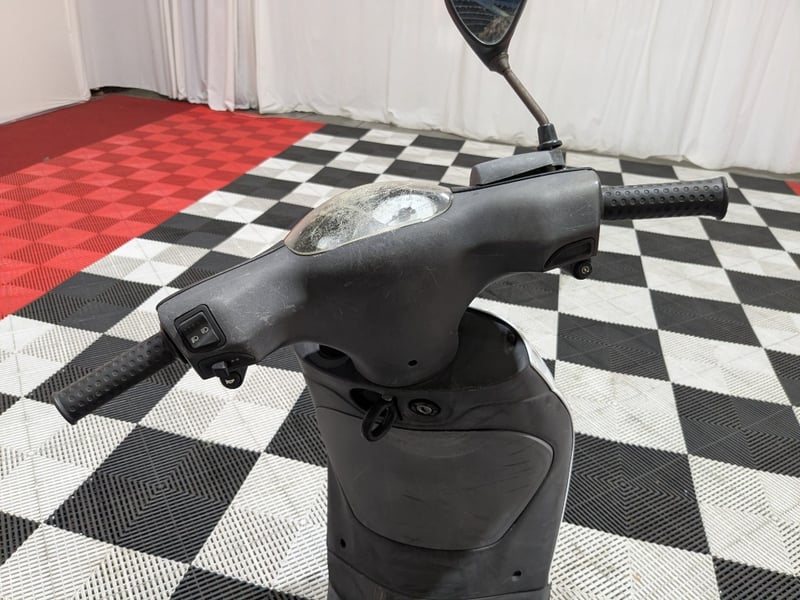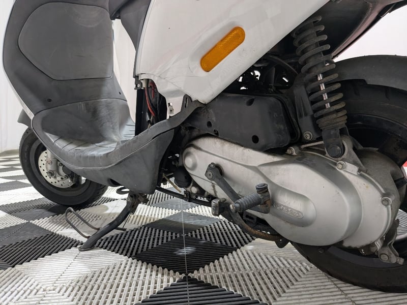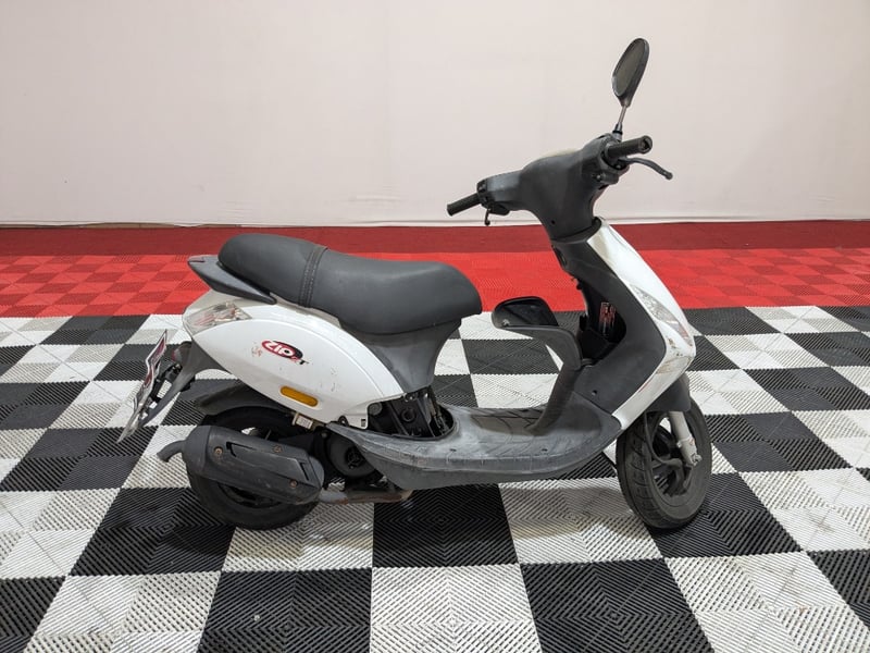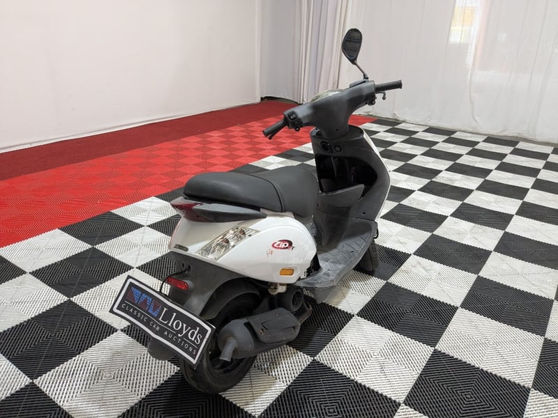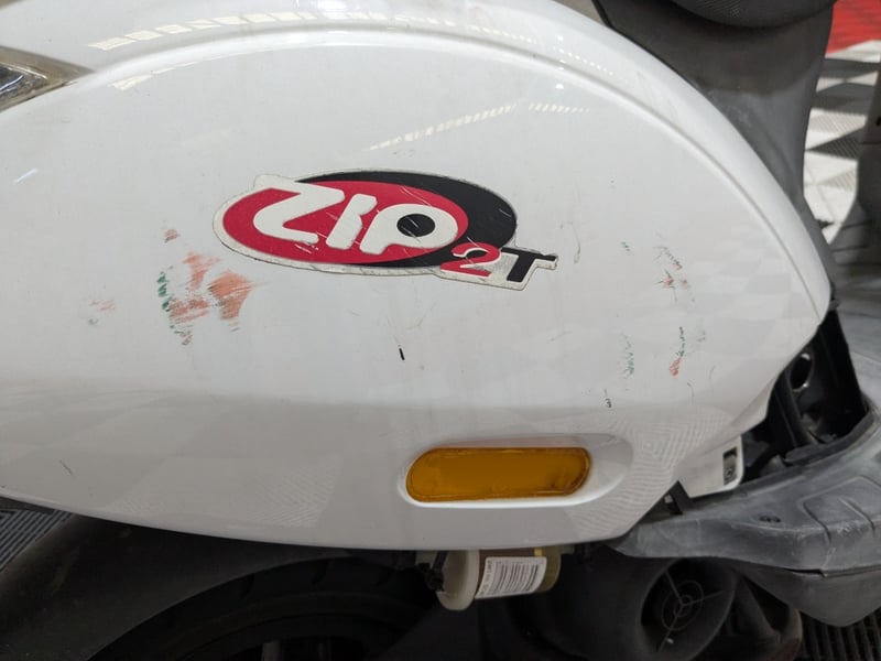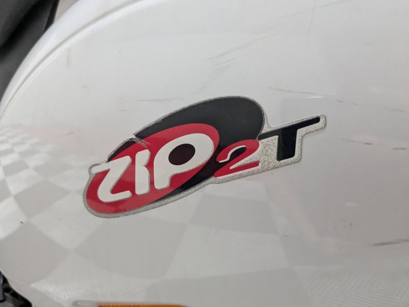 Description/extras: Step-through scooter frame, compact rounded rear body shape, single-piece seat design, tail-light and indicator cluster layout, The front fairing and handlebar cover style, 10" wheels typical of the Zip,