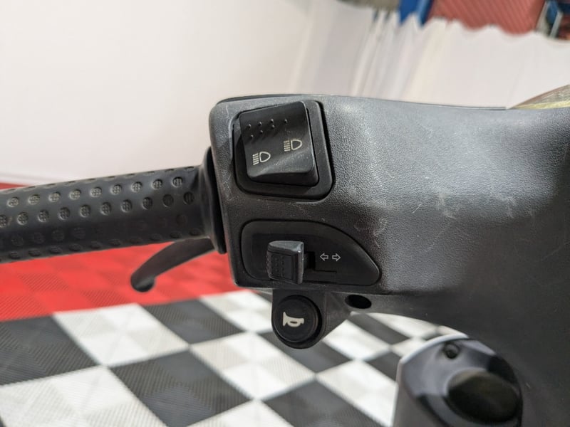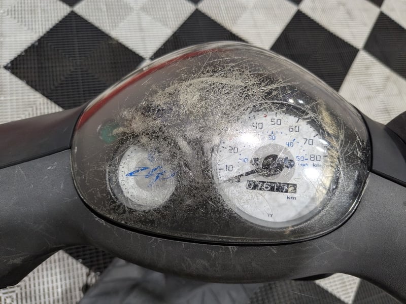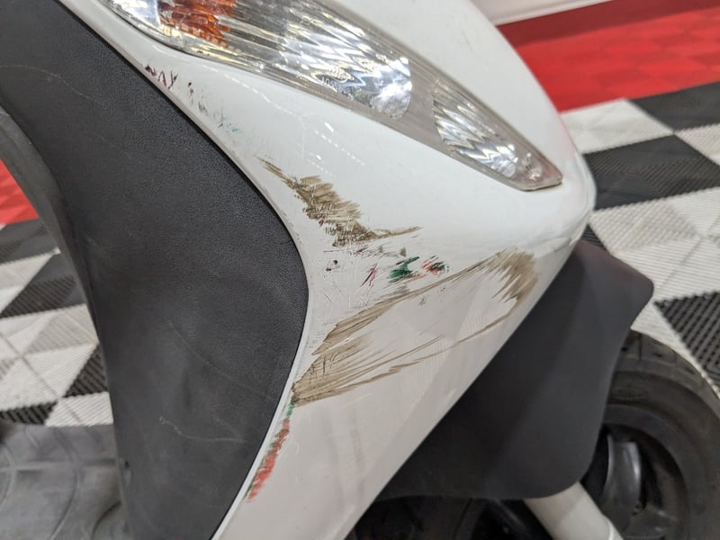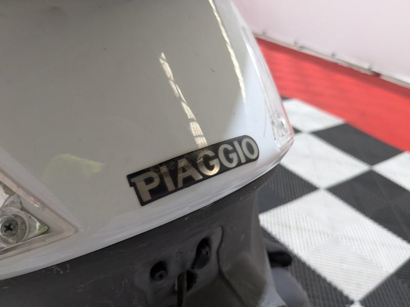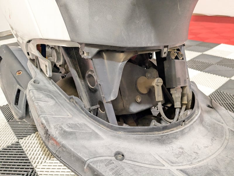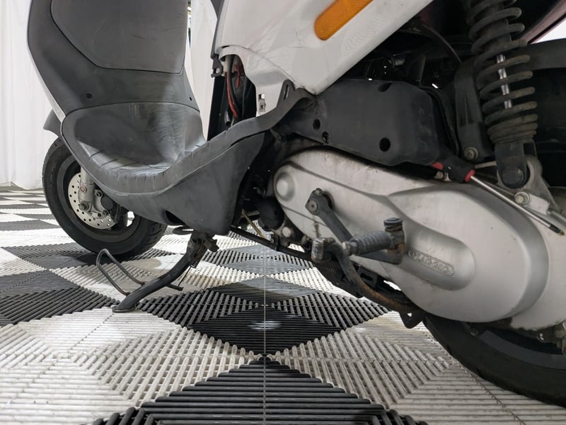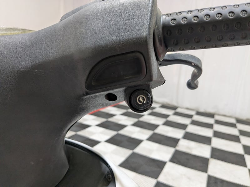 Description/extras: Step-through scooter frame, compact rounded rear body shape, single-piece seat design, tail-light and indicator cluster layout, The front fairing and handlebar cover style, 10" wheels typical of the Zip,