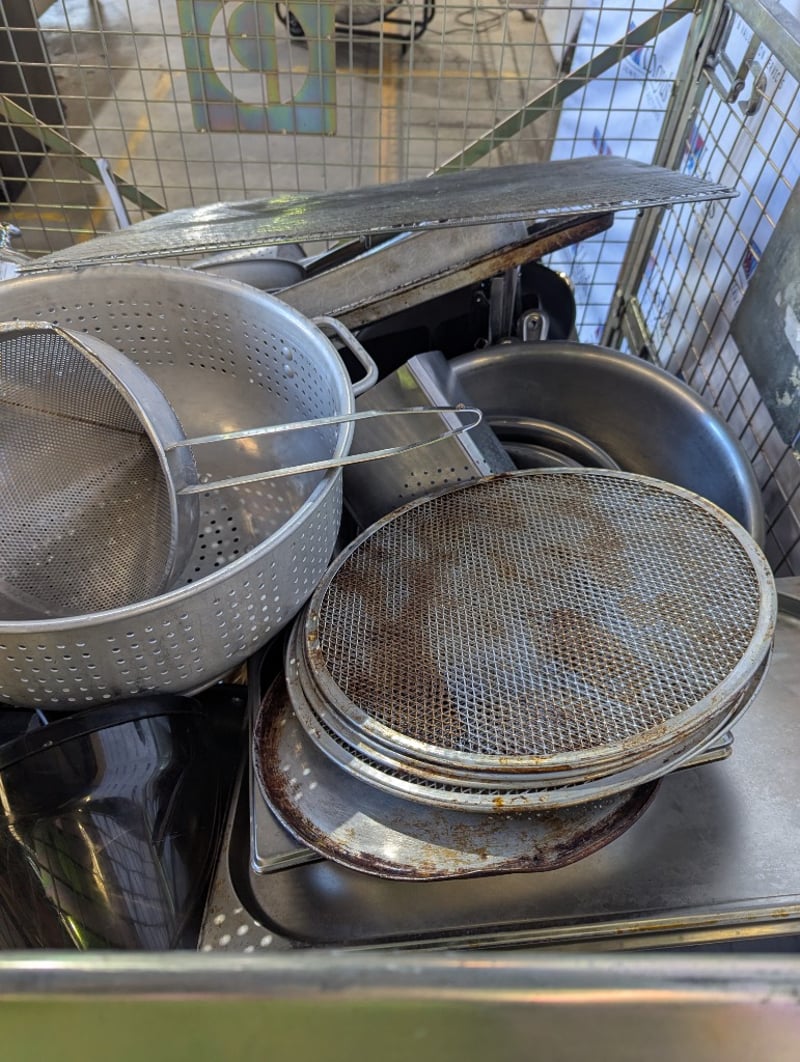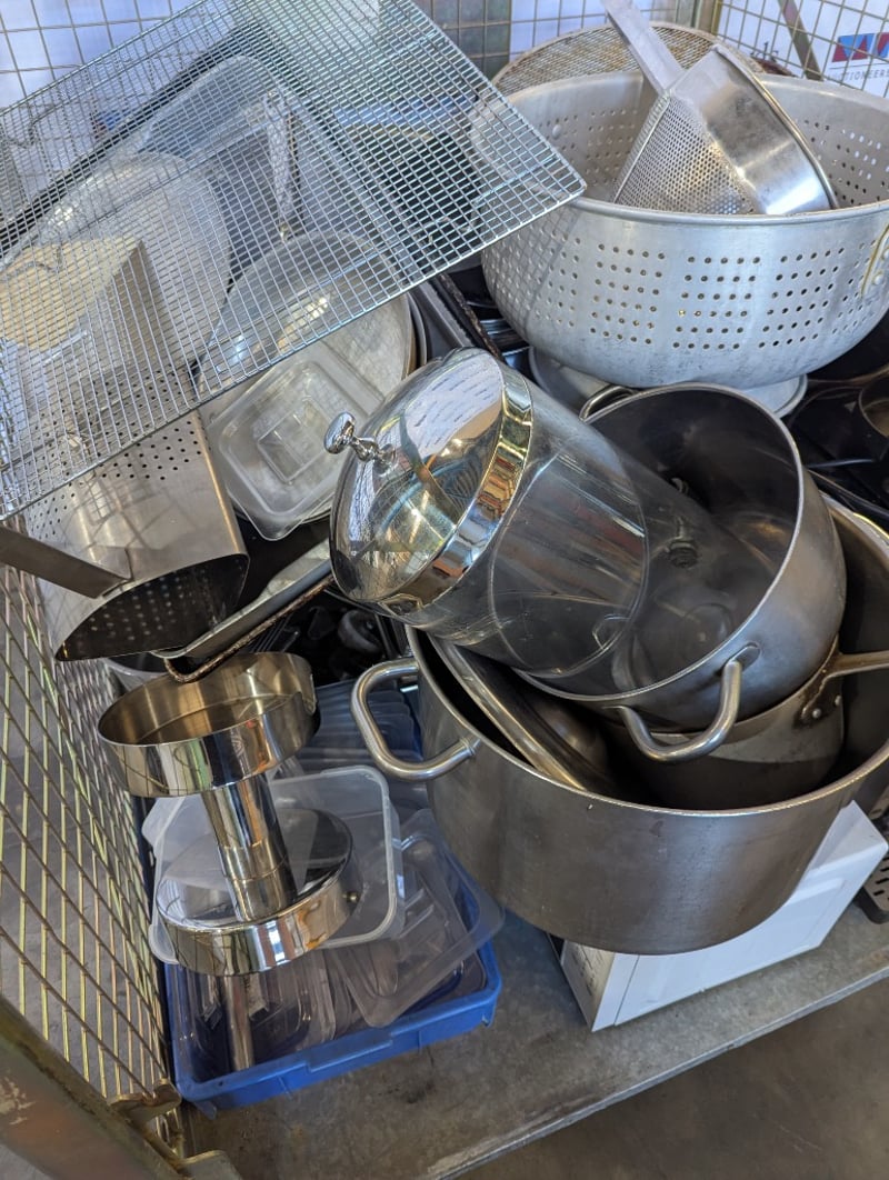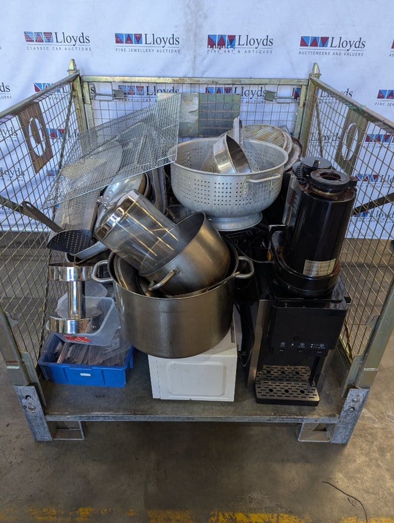 Assorted Lot Of Kitchenware And Utensils Including Pizza Trays, Pots and Pans, Ice Maker, Containers And MoreNote: Stillage Not Included, Sold As Lot