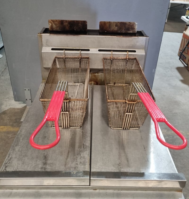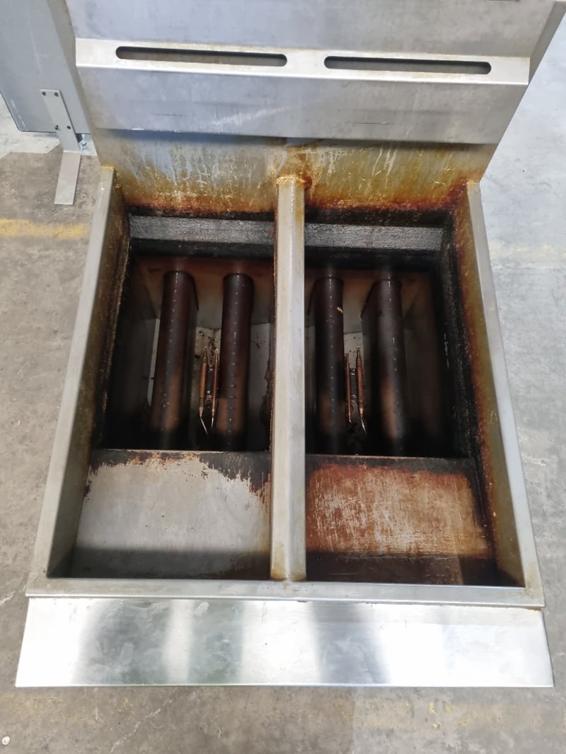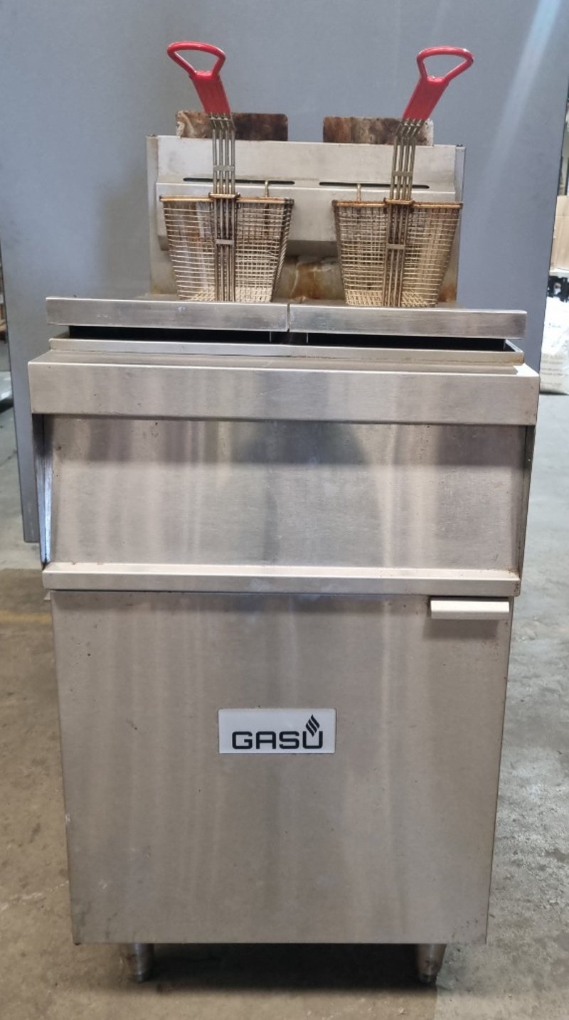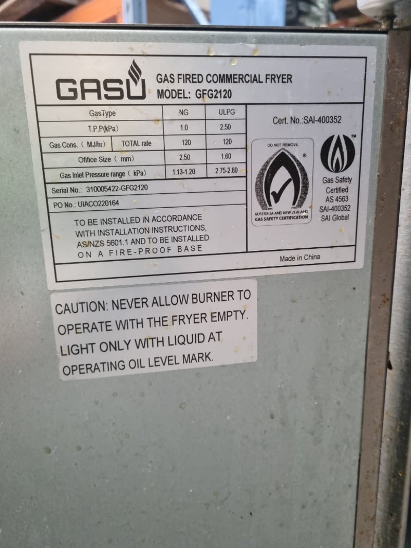 GASU Gas Fired Commercial Deep Fryer Model GFG2120. Stainless steel construction with dual frying baskets featuring red handles. Twin burner system with visible heating tubes and temperature controls. Unit includes oil drain valve, removable filter basket, and operational oil level indicators. Designed for natural gas (NG) or ultra-low pressure propane (ULPG) operation. Serial number 3100005422-GFG2120. Certified to AS/NZS 5601.1 standards with Gas Safety Certification SAI-400352. Shows significant carbon buildup and rust formation internally, indicating heavy prior use. External stainless steel panels show patina and wear marks. Equipment requires professional servicing and deep cleaning before operational use.