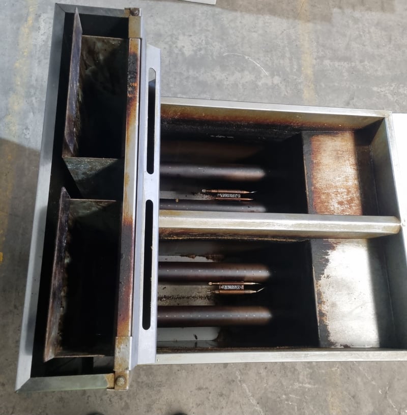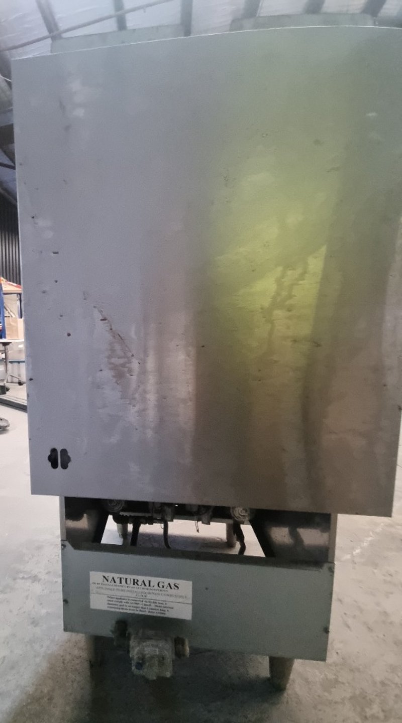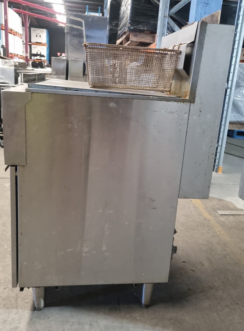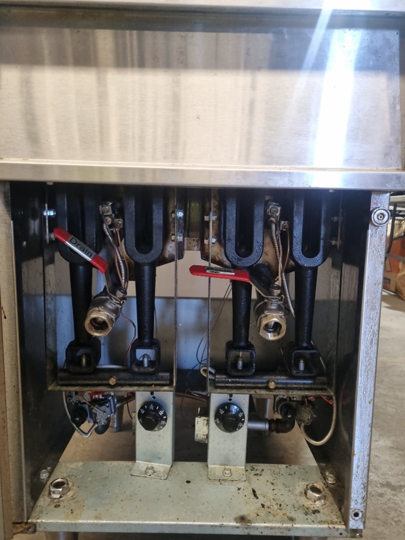 GASU Gas Fired Commercial Deep Fryer Model GFG2120. Stainless steel construction with dual frying baskets featuring red handles. Twin burner system with visible heating tubes and temperature controls. Unit includes oil drain valve, removable filter basket, and operational oil level indicators. Designed for natural gas (NG) or ultra-low pressure propane (ULPG) operation. Serial number 3100005422-GFG2120. Certified to AS/NZS 5601.1 standards with Gas Safety Certification SAI-400352. Shows significant carbon buildup and rust formation internally, indicating heavy prior use. External stainless steel panels show patina and wear marks. Equipment requires professional servicing and deep cleaning before operational use.