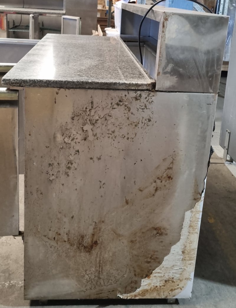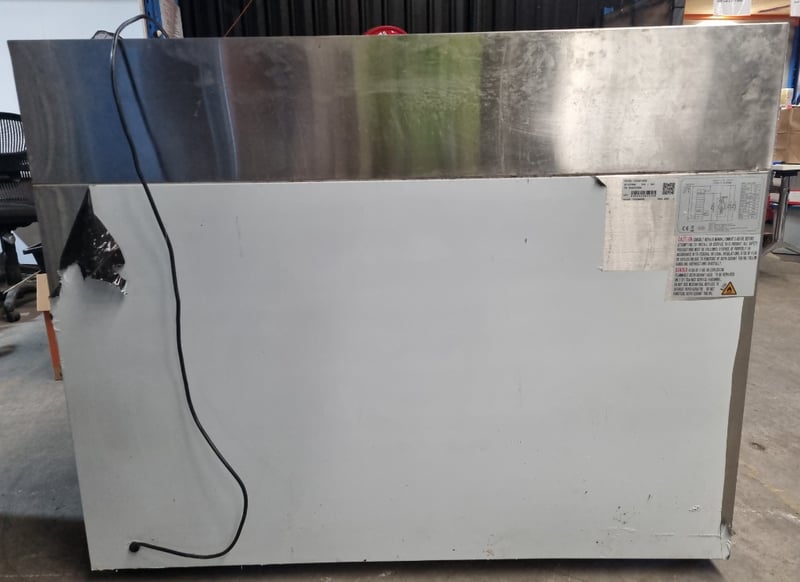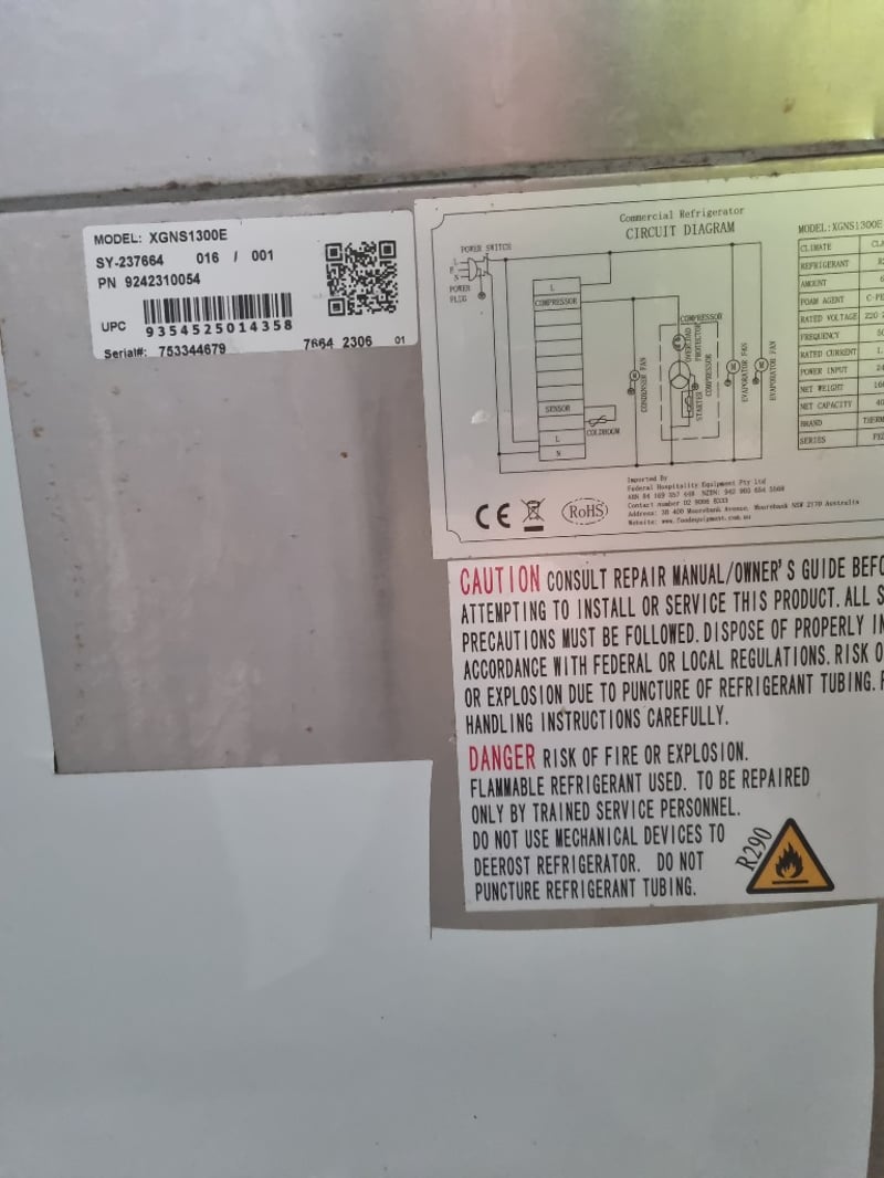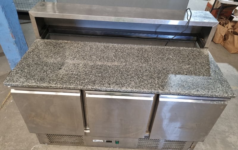 FED-X commercial refrigerated sandwich prep counter featuring three stainless steel doors with glass fronts and magnetic closures. Equipped with granite-effect work surface top and internal wire shelving. The unit houses a refrigeration system housed beneath the counter with dual cooling zones and perforated stainless steel base panels. Control panel includes digital display, power switch, and indicator light. Model XGNs1300E identified on nameplate. Shows moderate cosmetic wear consistent with commercial kitchen use including surface oxidation and minor soiling on exterior panels. Refrigeration system with flammable refrigerant (requires trained service personnel for maintenance). Suitable for food service, delicatessens, or cafes requiring chilled food storage and preparation.