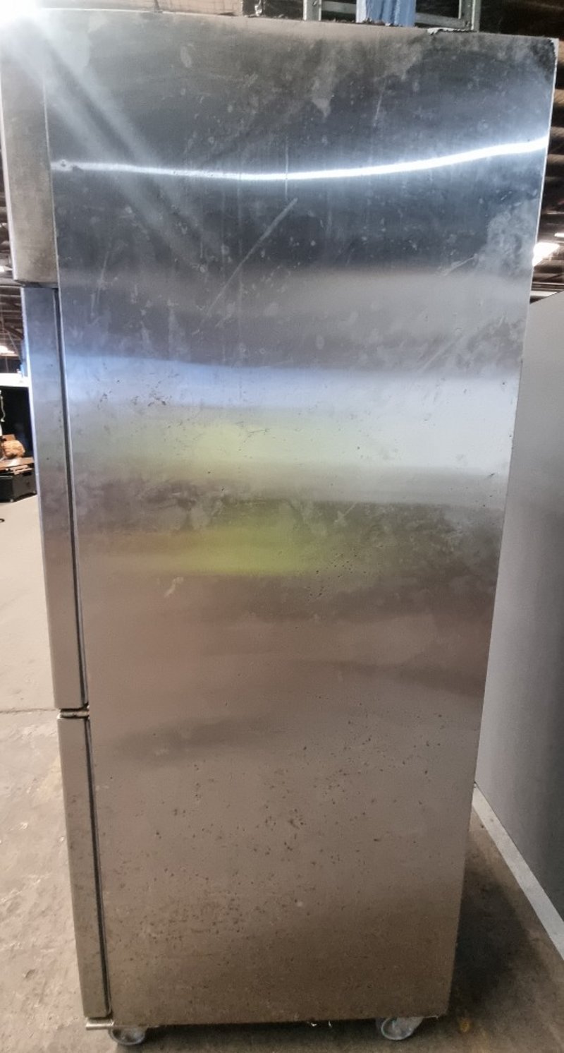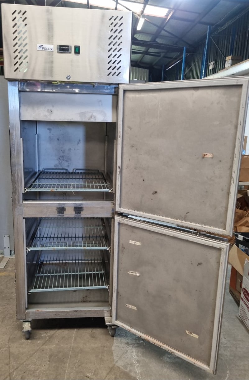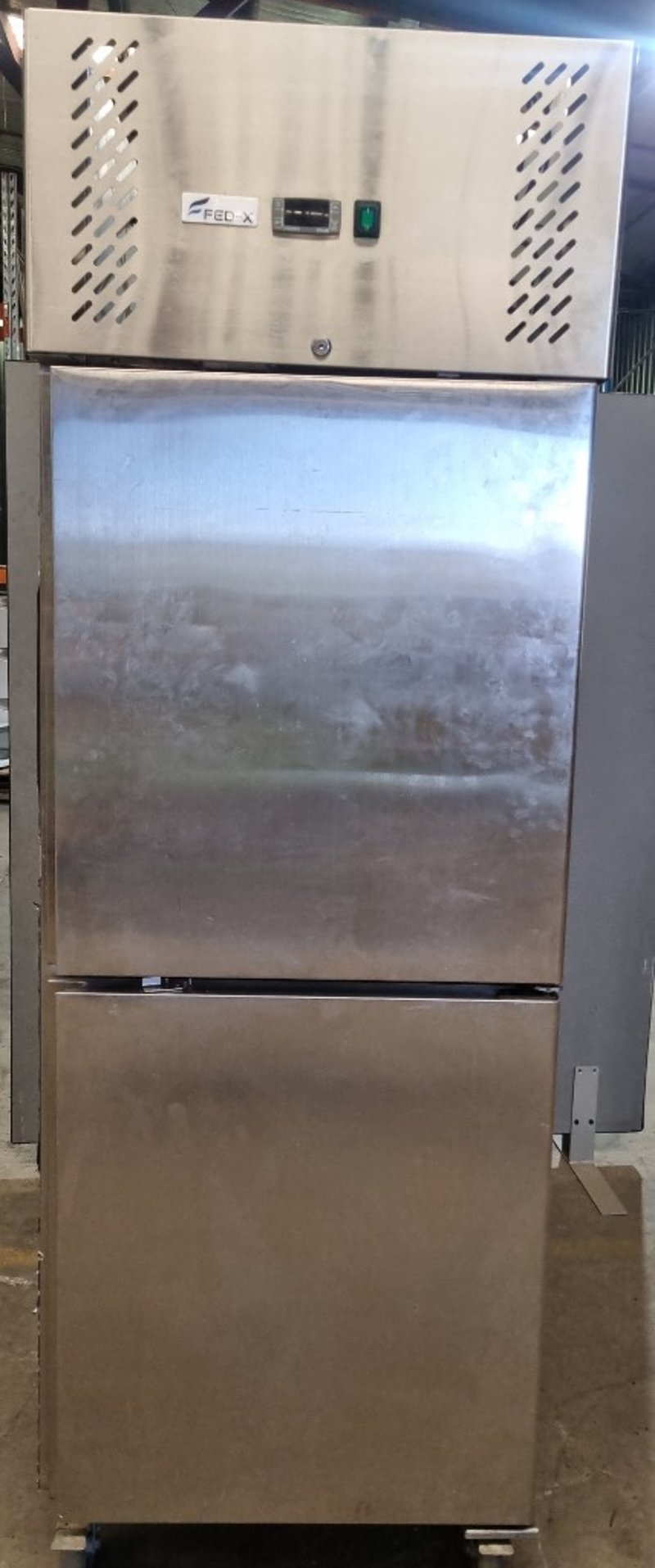 Commercial upright freezer unit featuring dual-door configuration with stainless steel exterior and interior shelving. Model XURF0081V with FED-X branding. Top-mounted refrigeration unit with control panel featuring digital display and power switch. Single-phase operation. Interior comprises three wire shelves per door section. Unit shows visible wear and oxidation to stainless steel surfaces consistent with commercial kitchen use. Compressor and refrigeration system visible in rear cavity. Requires professional servicing and deep cleaning. Suitable for commercial food storage applications.