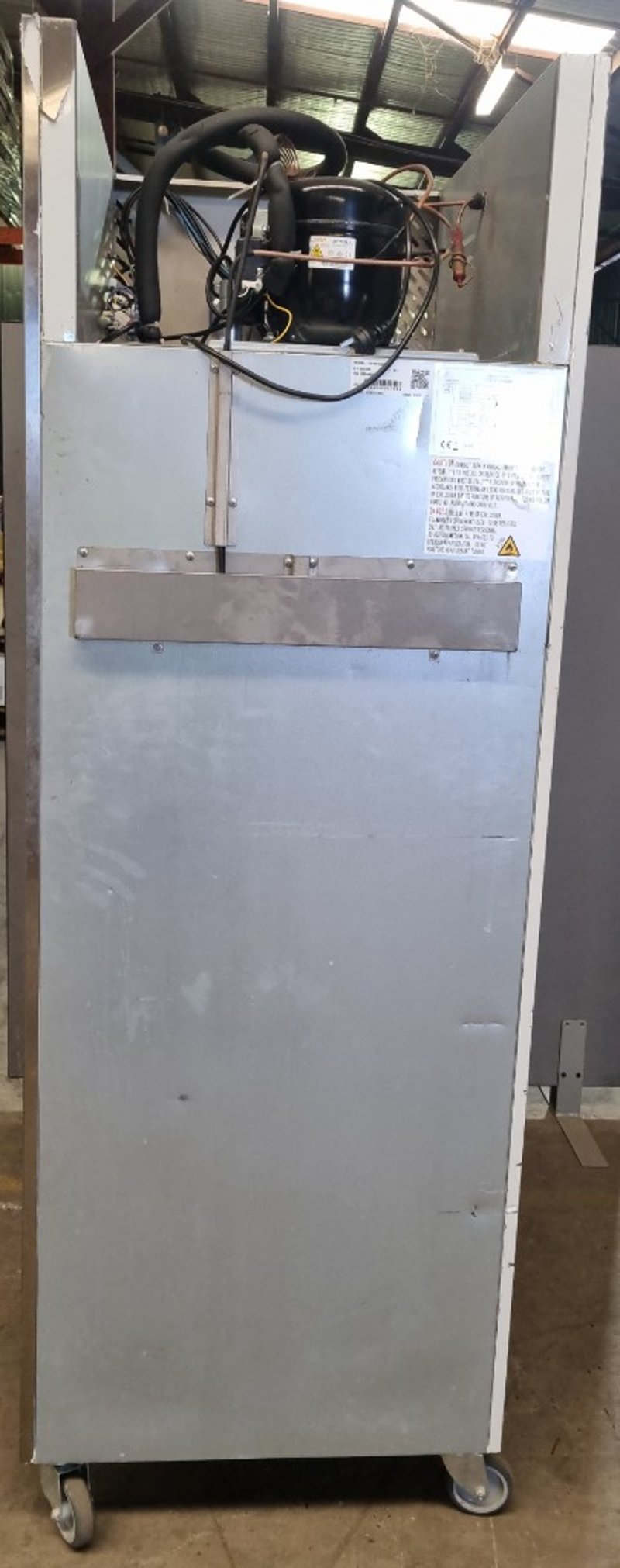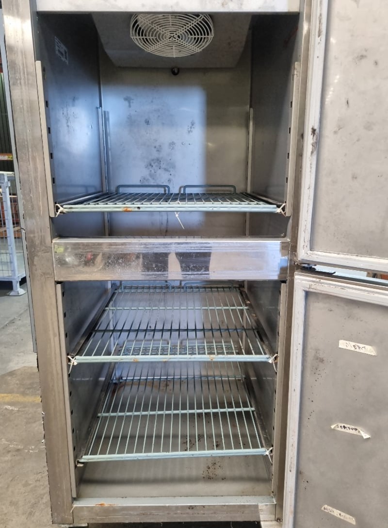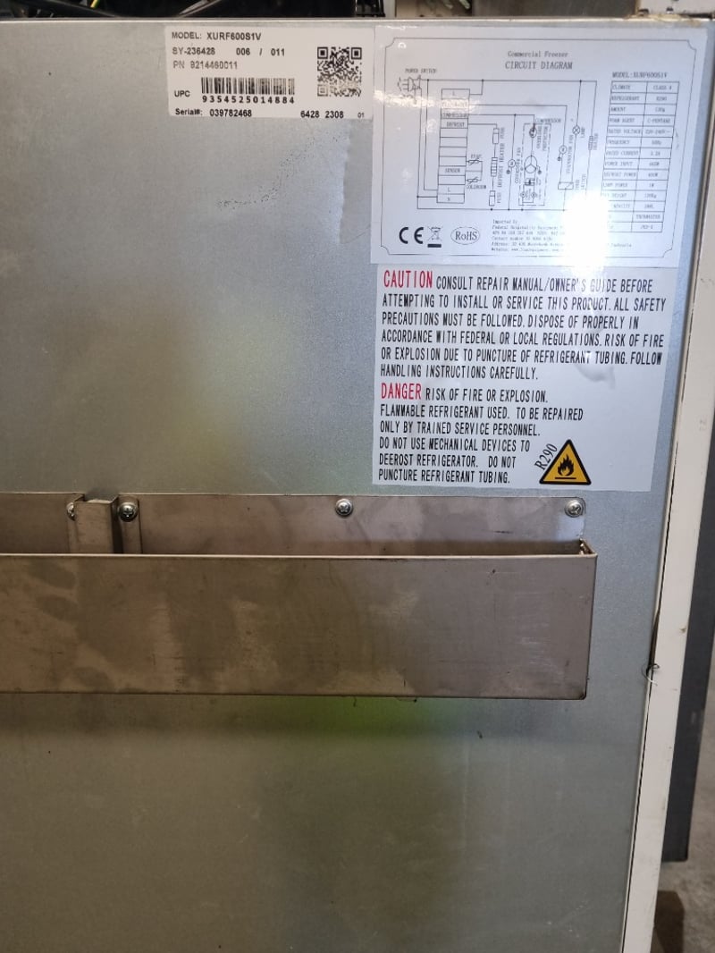 Commercial upright freezer unit featuring dual-door configuration with stainless steel exterior and interior shelving. Model XURF0081V with FED-X branding. Top-mounted refrigeration unit with control panel featuring digital display and power switch. Single-phase operation. Interior comprises three wire shelves per door section. Unit shows visible wear and oxidation to stainless steel surfaces consistent with commercial kitchen use. Compressor and refrigeration system visible in rear cavity. Requires professional servicing and deep cleaning. Suitable for commercial food storage applications.