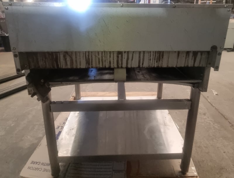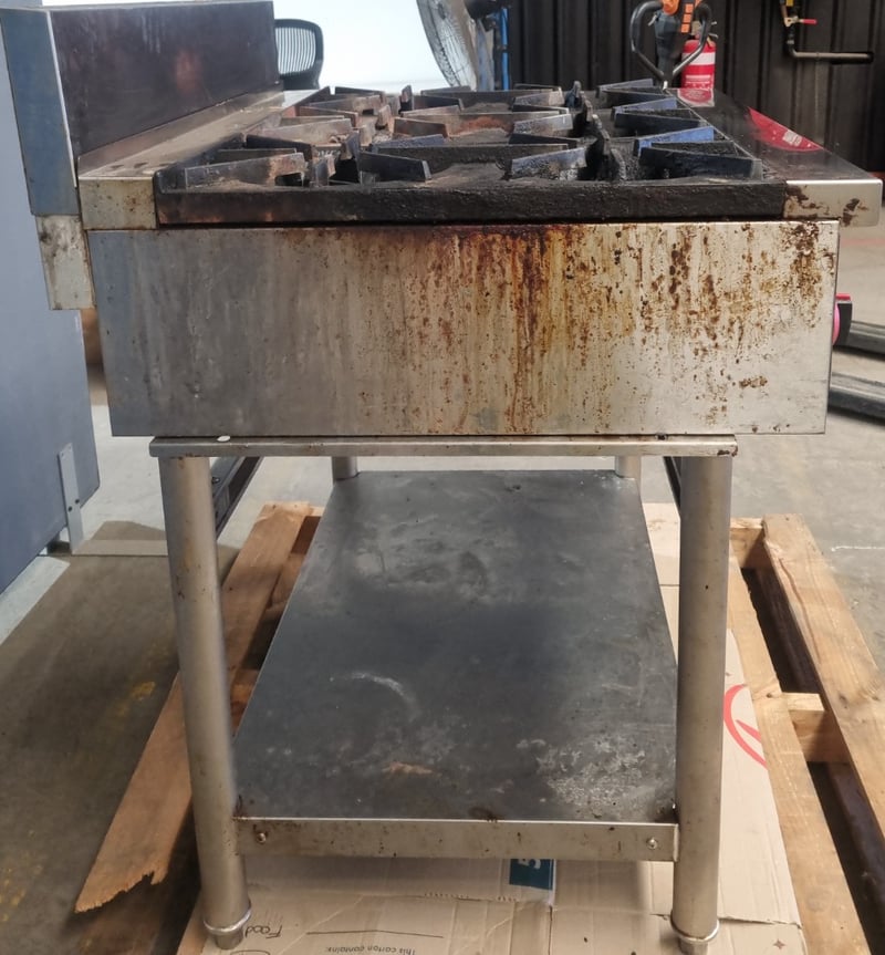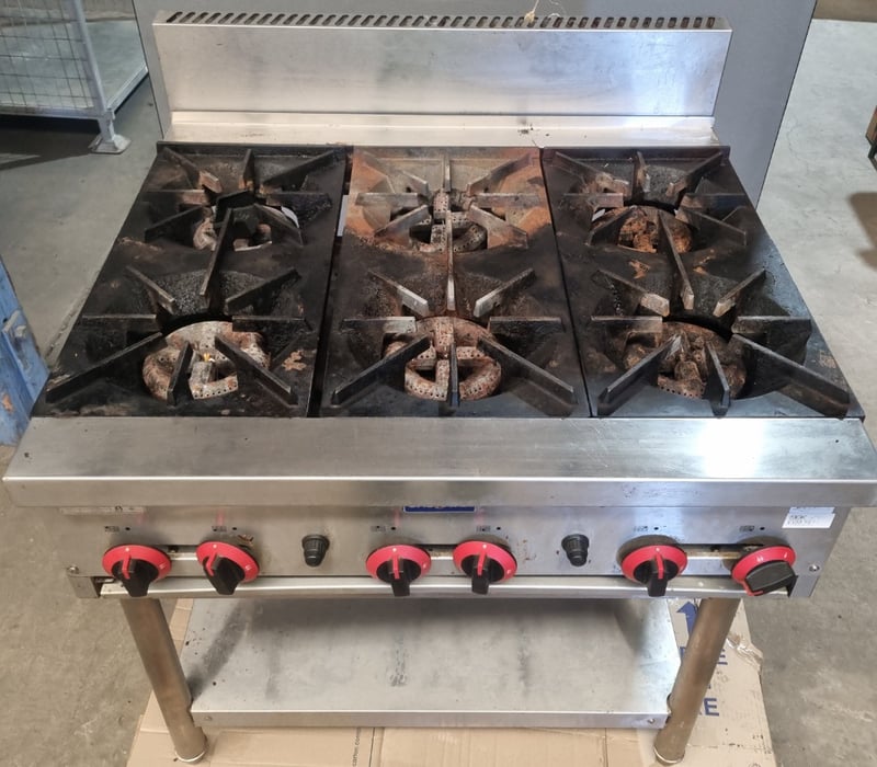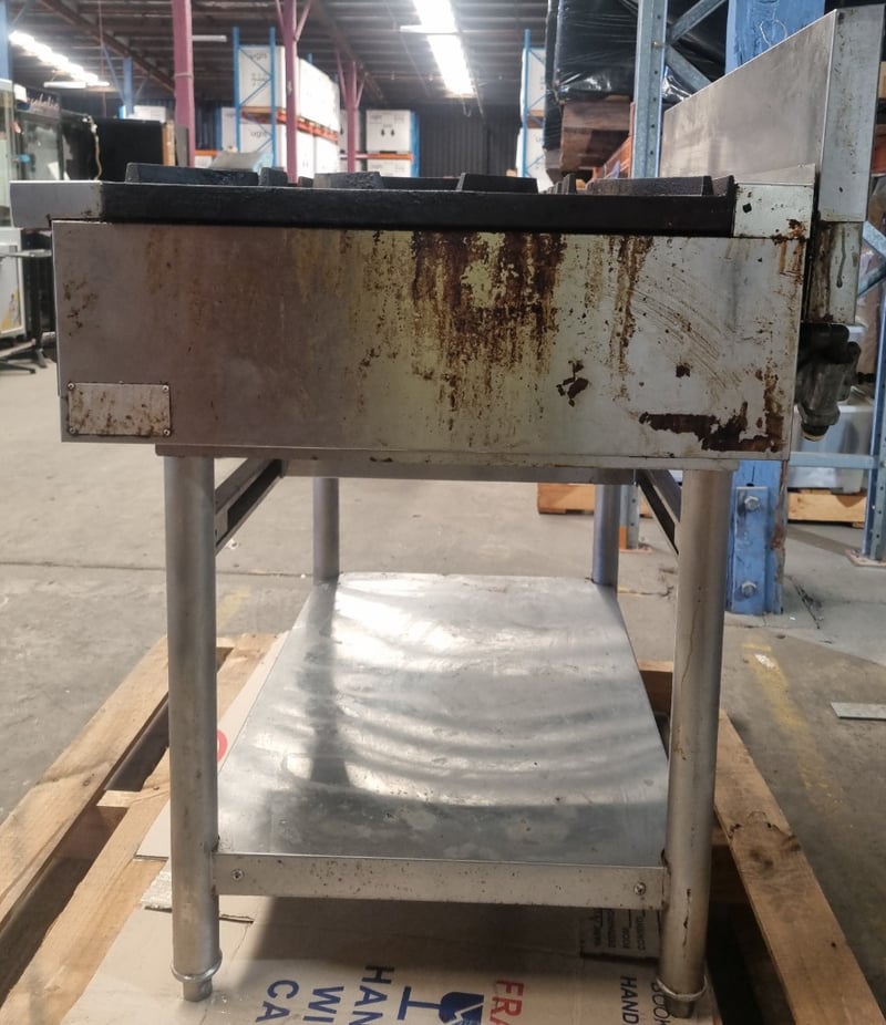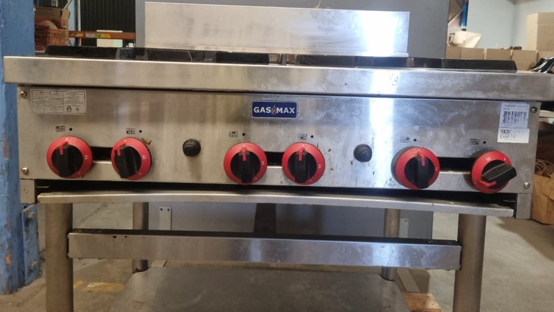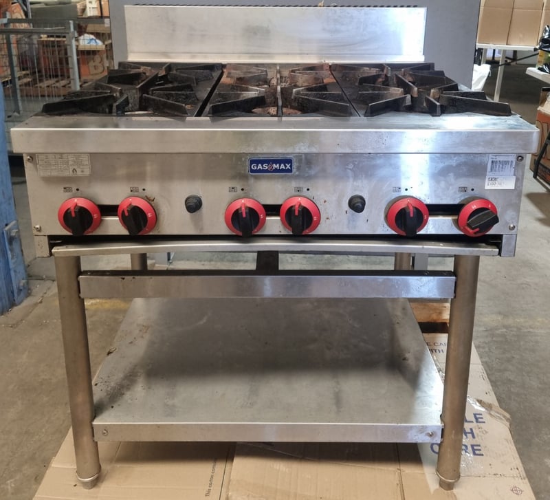 Gas Max commercial 6-burner cooktop mounted on stainless steel stand with undershelf. Features six independently controlled gas burners with red control knobs, suitable for high-volume food preparation. Heavy-duty stainless steel construction with open shelving underneath for storage. All burners appear functional with cast iron trivets. Ideal for commercial kitchen, restaurant, or catering operations. Stand-alone unit ready for gas connection.Note: Signs of wear, untested, missing fixtures for back piece.