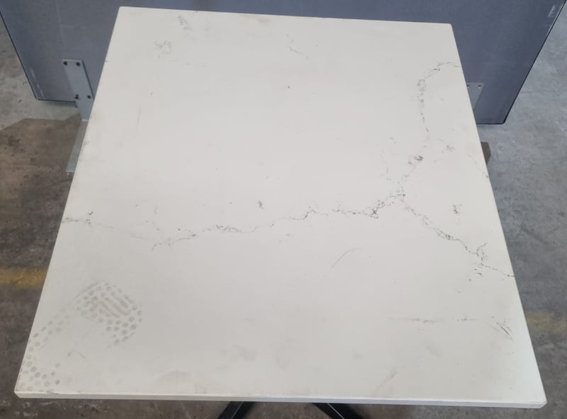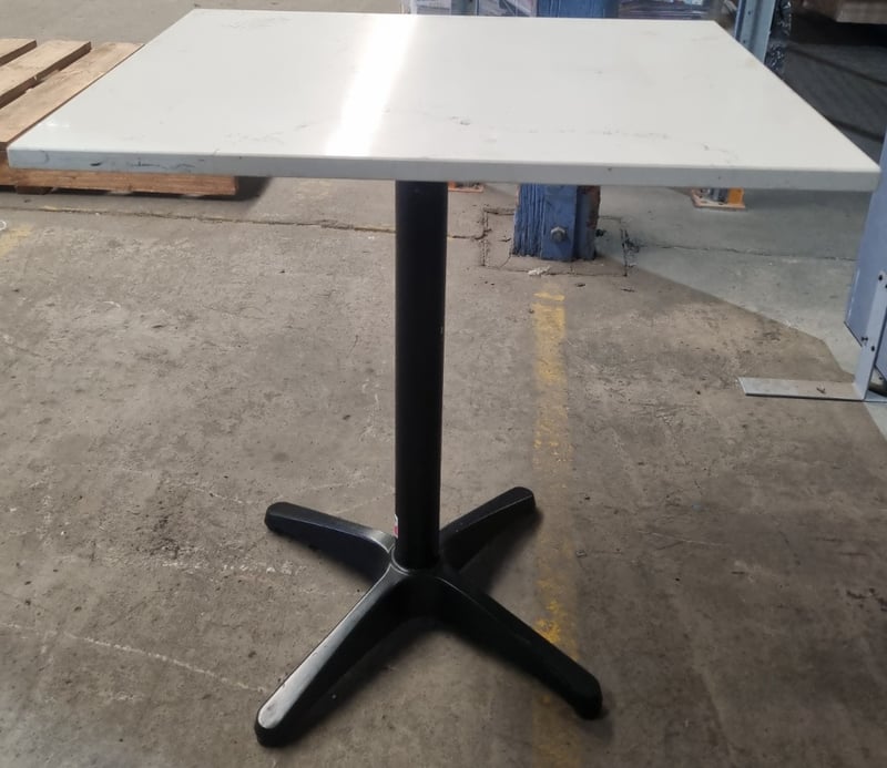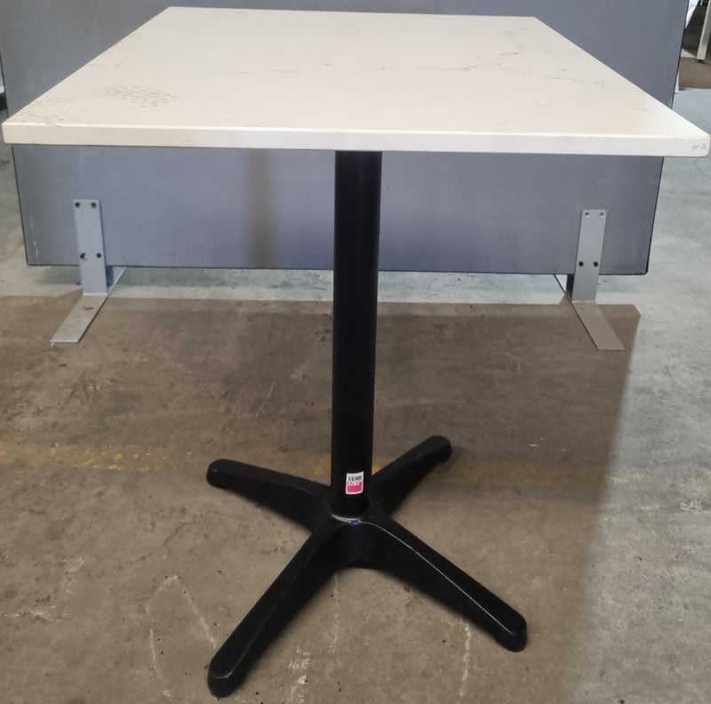 Commercial-grade pedestal dining table featuring a white marble-effect laminate top with visible wear patterns and surface marks. Black powder-coated metal column support with four-pronged star base configuration. Modular design with grey side panels and white bracket feet, suggesting knock-down construction for ease of transport. Suitable for cafes, restaurants, or hospitality venues. Shows signs of moderate use consistent with commercial environment. Dimensions: (H)75cm x (W)70cm x (D)60cm Qty: 9 tables, bid per each must take all. Note: missing fixtures.