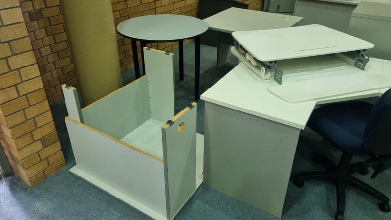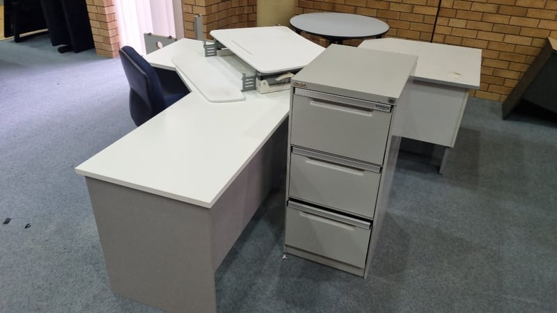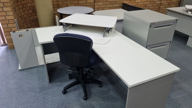 Corner office Desk With Desk Riser, Side Corner Addon, Chair And 3 drawer filing Cabinet and round Table