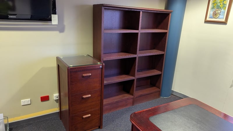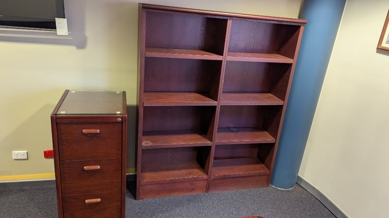 Timber Book Shelves, Four Shelves, Joined Together, 3 Drawer Filing Cabinet, Dimensions 175cm(H)×140cm(W)×33cm(D), 100cm(H)×49cm(W)×57cm(D) Quantity 3