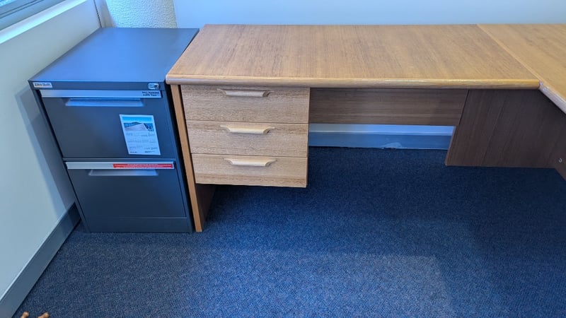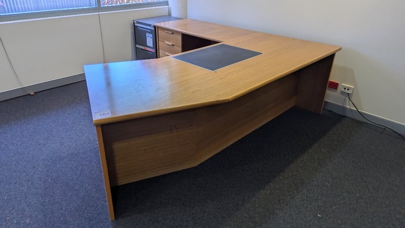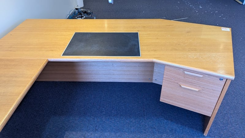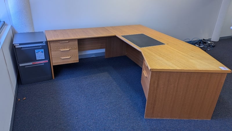 Timber Corner Desk, Built in Drawers (5), Leather Writing Pad, Two Drawer Filing Cabinet, Dimensions 74cm(H)×241cm(W)×214cm(D)