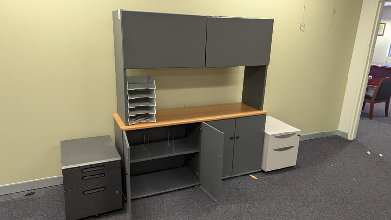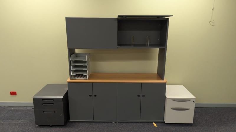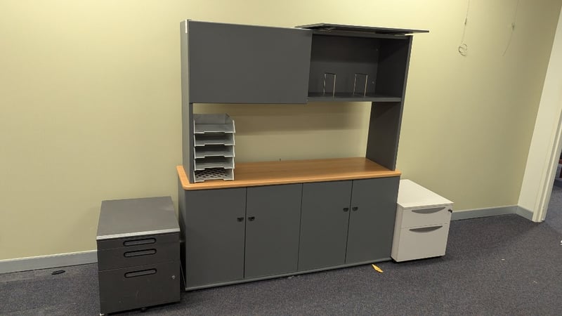 Storage Unit with 4 Doors and Shelves, 2 × Small Filing Cabinets, Dimensions 176cm(H)×166cm(W)×48cm(D), Quantity 3Sold As Lot
