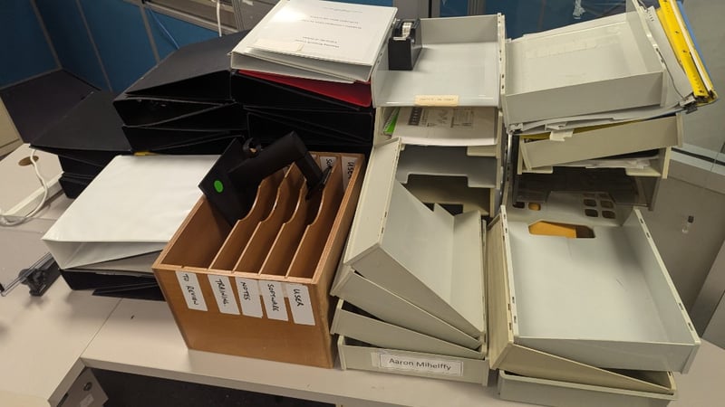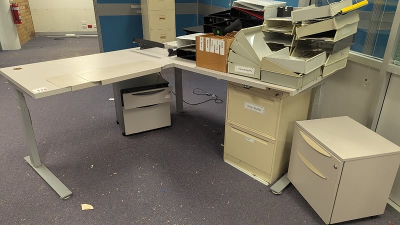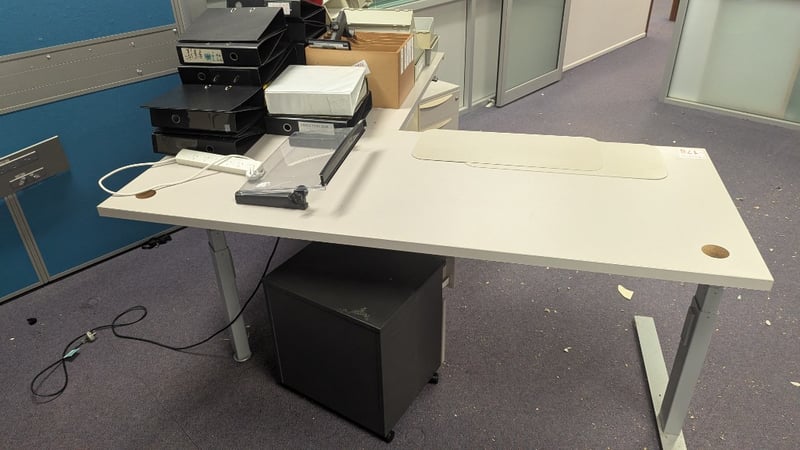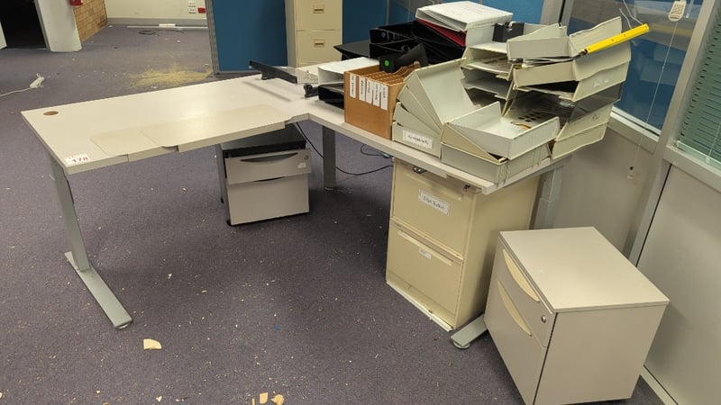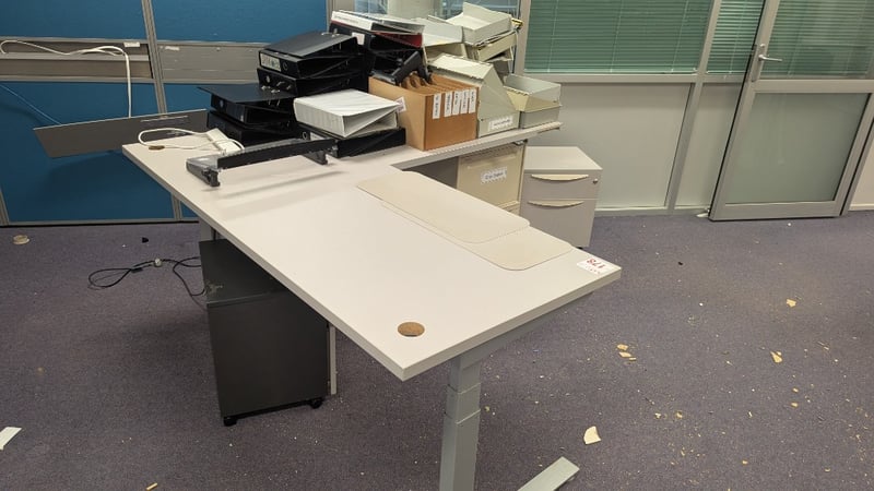 Electronic Adjustment Office Desk, 2 Drawer Filing Cabinet, Side Drawers Incudes Contents on Table, Dimensions (Table)) 78cm(H)×180cm)W)×180cm(D), Quantity Per Lot Sold As Lot