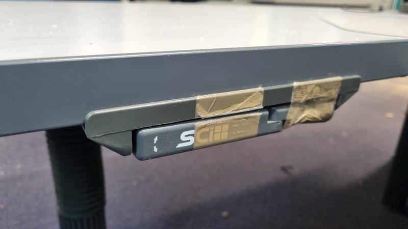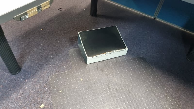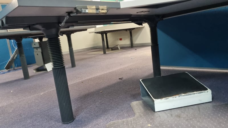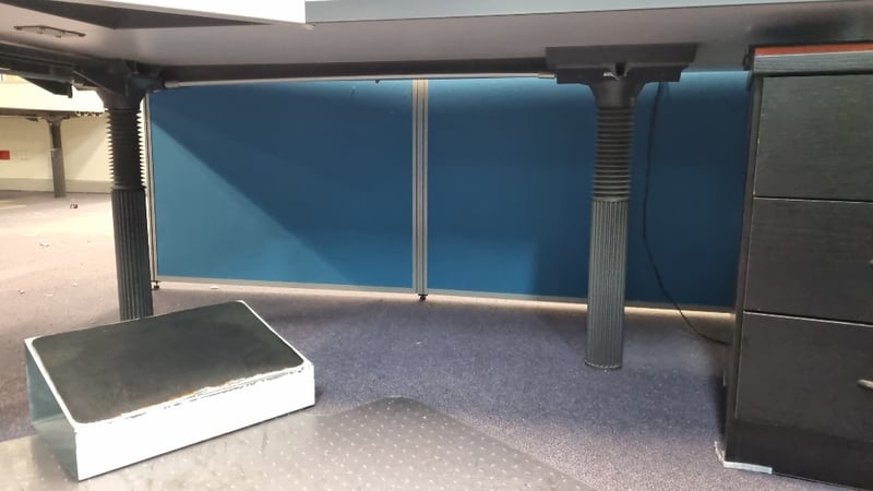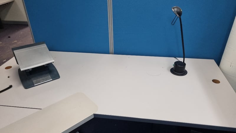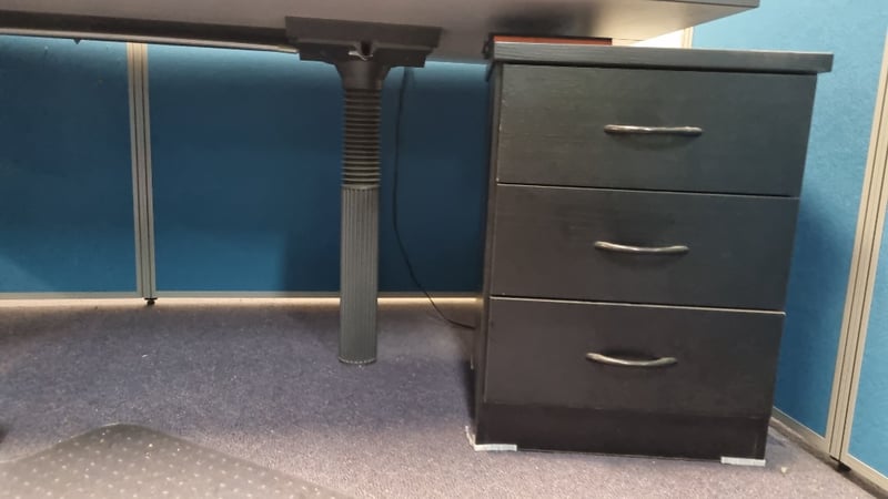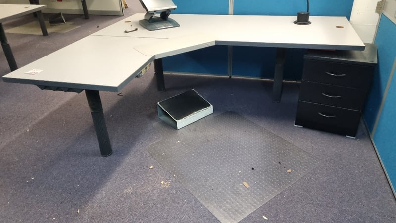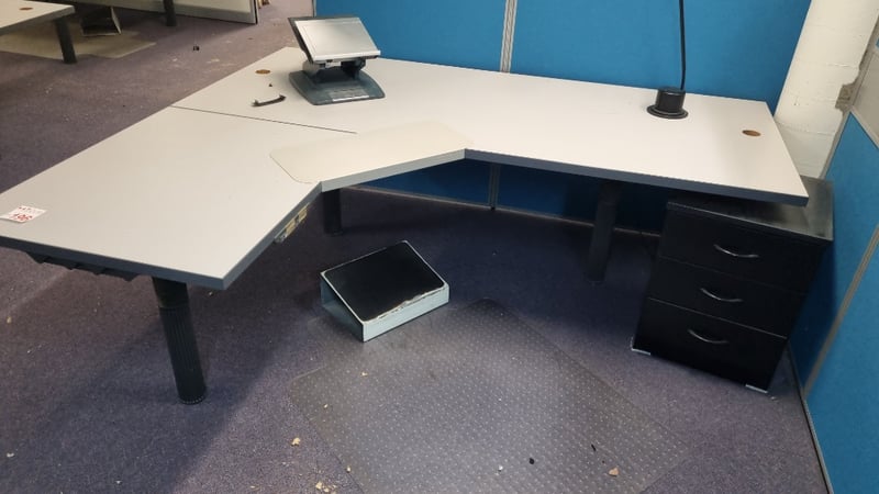 Manual Height adjustable Corner Office Desk 3 drawer Unit, foot rest, Lamp and and Fellows document holderDimensions 75cmH x 180cmW x 172cmDSold as Lot