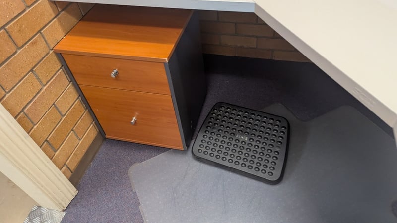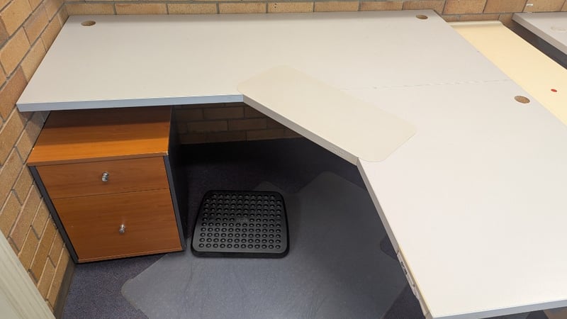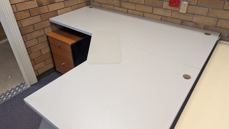 Corner Office Desk, Adjustable, 2 Drawer Unit, Dimensions 75cm(H)×180cm(W)×165cm(D), Quantity 2 Sold As Lot
