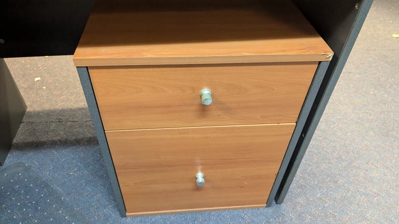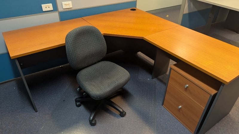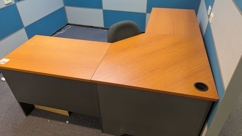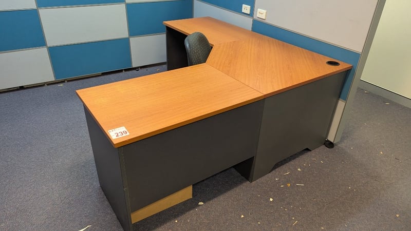 Corner Office Desk, 2 Drawer Unit, Swivel Chair, Dimensions 73cm(H)×180cm(W)×180cm(D), 56cm(H)×46cm(W)×43cm(D), Quantity 3Sold As Lot
