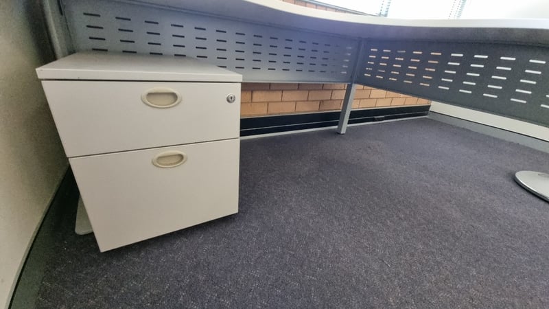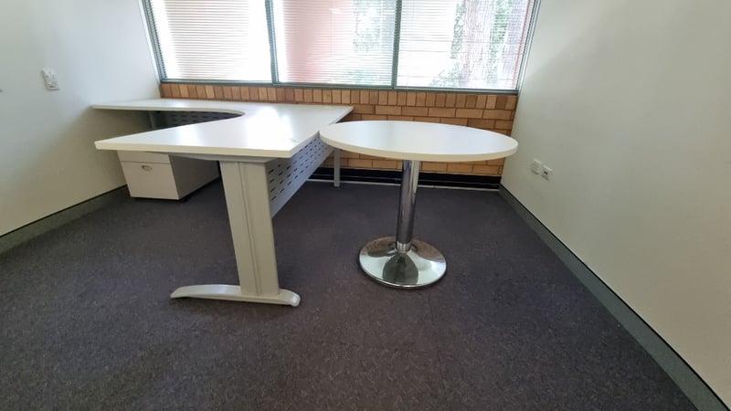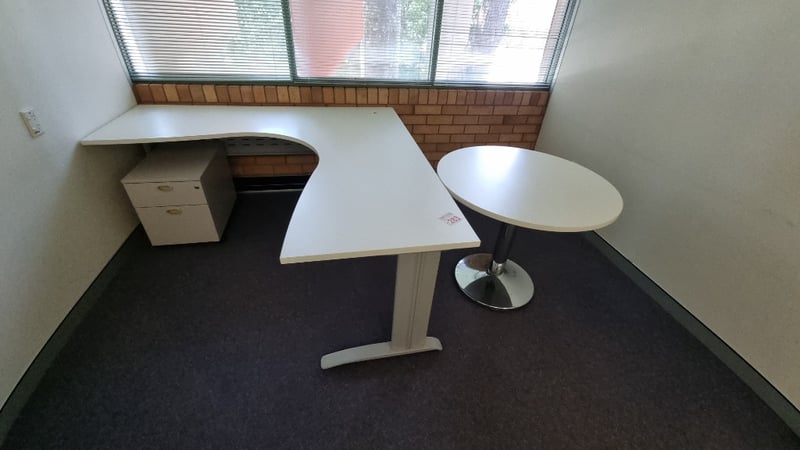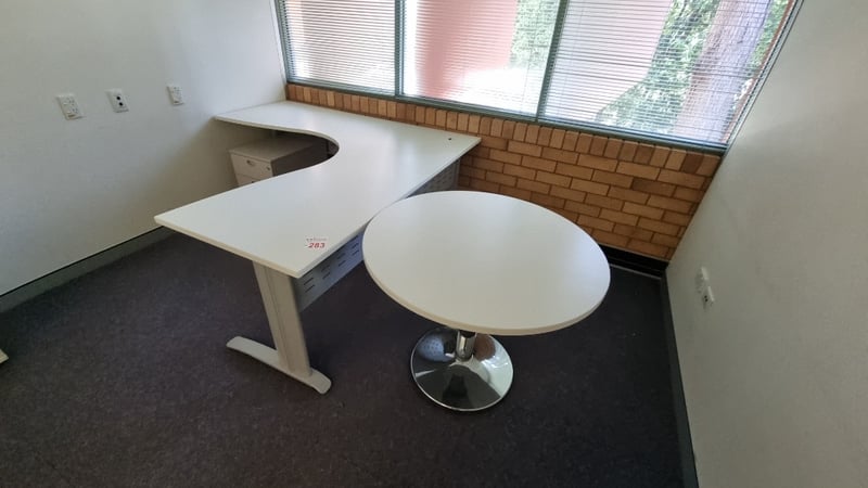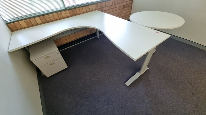 Corner Office Desk with 2 draw unit and Round TableDimensions 75cmH 180cmW x 180cmDSOLD AS LOT