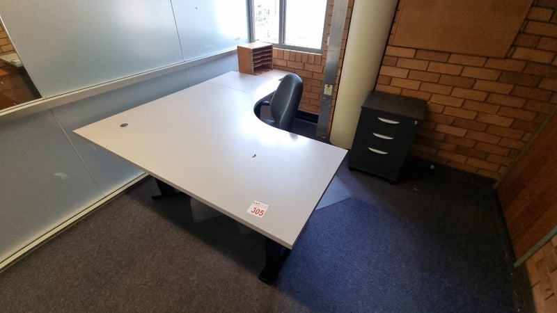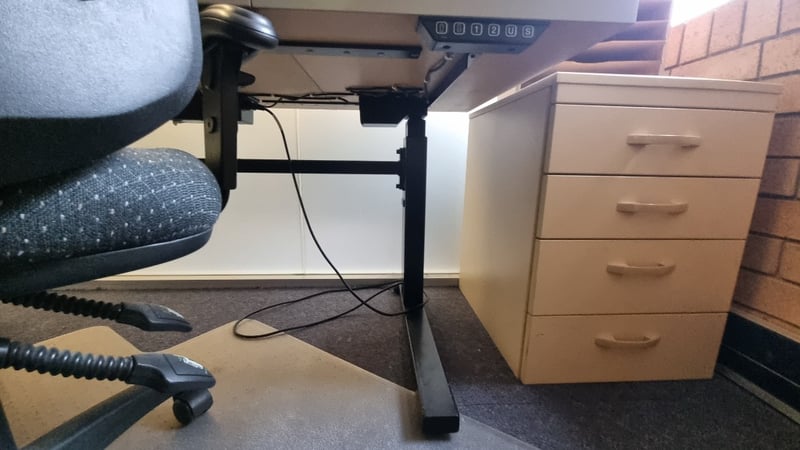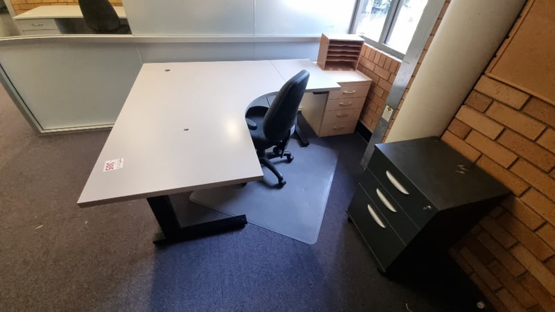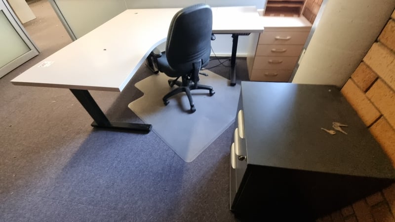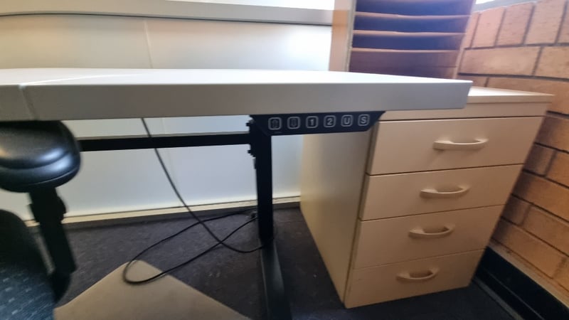 Corner Electric Height adjustable Office Desk With Chair And 2x Under Desk DrawsDesk Dimensions 75cmH x 165cmW x 165cmDSold as Lot