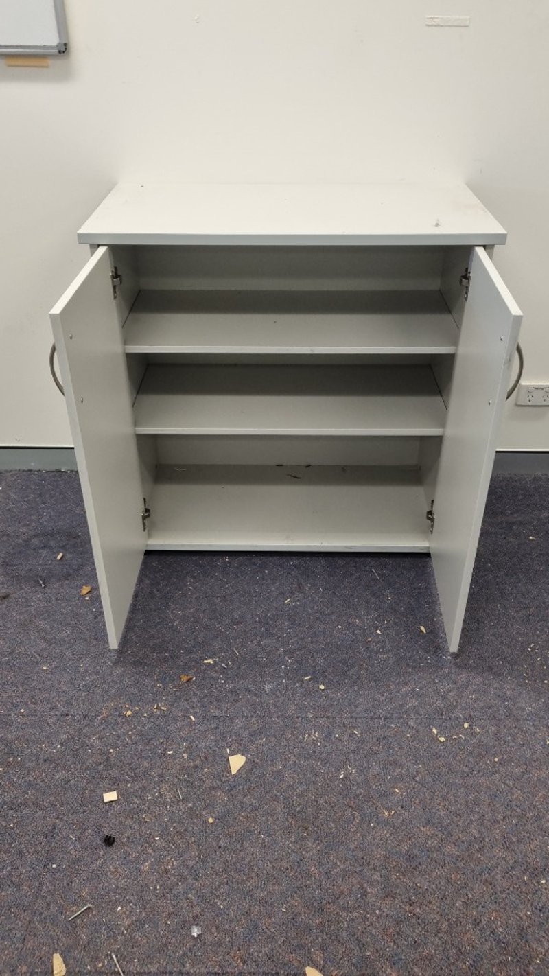 Storage Cabinet 2 door With Adjustable Internal ShelvesDimensions 90cmH x 90cmW x 46cmDSOLD as Lot - Buyer to Provide Safe removal of Asset