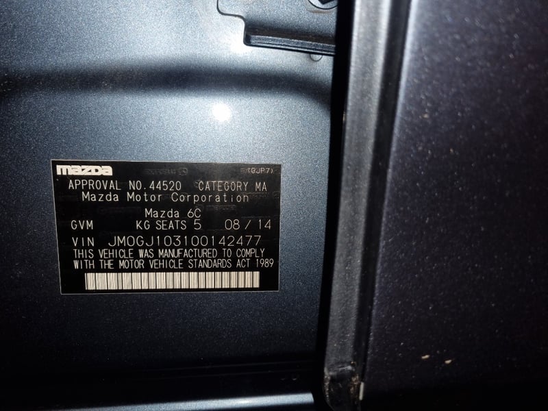 2014 Mazda 6 Year: 2014Make: MazdaModel: 6Body: 4-Door SedanDrive Type: Front wheel driveOdometer: Indicating 201,408 KilometersEngine: 2.5 PetrolTransmission: AutomaticColour: BlueSeats: 5Description/extras: Air Conditioning, Power windows, SRS, Sat Nav, Cruise control, Alloy wheels, Reverse camera, Central locking, CD player. Damage to passenger rear door Price Guide - $3,900 - $5,100 (Based on Unmodified Vehicle)VIN: JM0GJ103100142477ENG No: PY20432752 (as per PPSR)#PCV(Key #20B Marple)Lloyds stock #580914+1