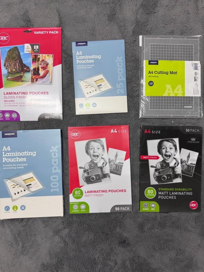 OFFICE SUPPLIER LOT: Premium Matt Laminating Pouches (80 Microns)-Matt Laminating Pouches A4- A4 Laminating Pouches- A4 Cutting Mat- Glass Finish Laminating Pouches-A5 Laminating Pouches- SOLD AS LOT-RRP:Premium Matt Laminating Pouches 74$-Matt Laminating Pouches A4 44$-A4 Laminating Pouches 15$-A4 Cutting Mat 50$Glass Finish Laminating Pouches 21$-A5 Laminating Pouches 15$