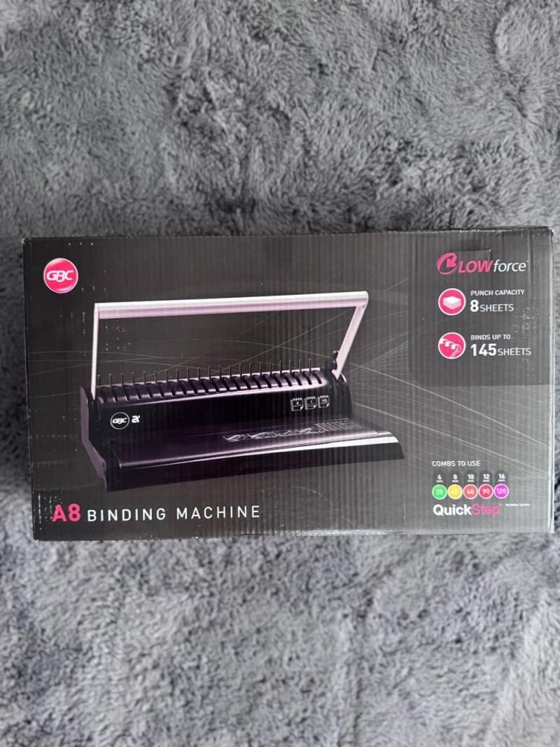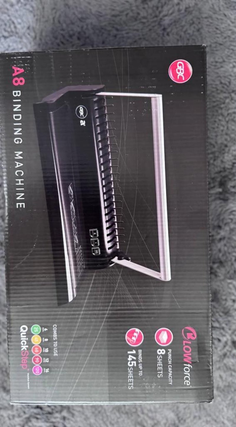 A8BINDING MACHINE - Punch capacity 8 sheets-Binds up to 145 sheets- Coms to use 6mm-8mm-10mm-12mm-16mm