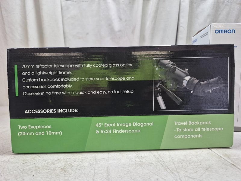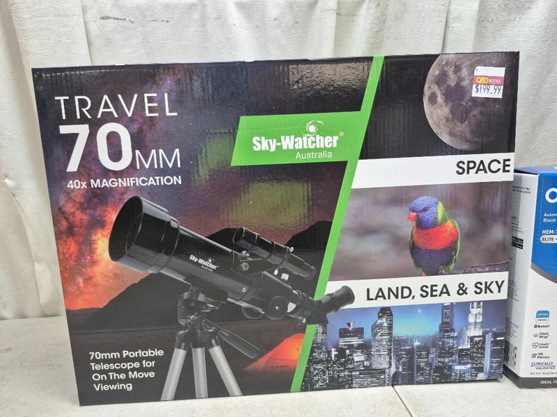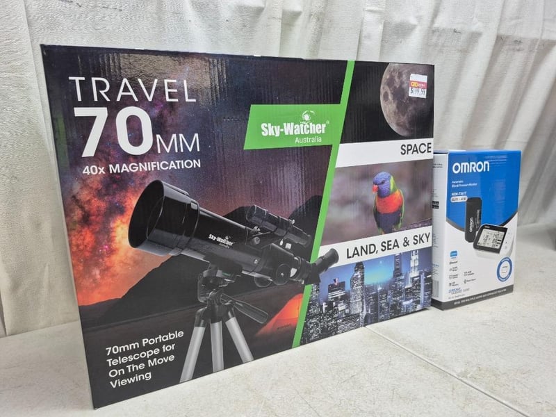 1x SKY-WATCHER travel 70mm, 40x mgnification, with travel backpack,RRP $199.99, NEW in box, 1x OMRON automatic blood pressure monitorm, model: HEM-7361T, elite + AFIB, includes storage case, RRP $ 193, NEW factory sealed in box