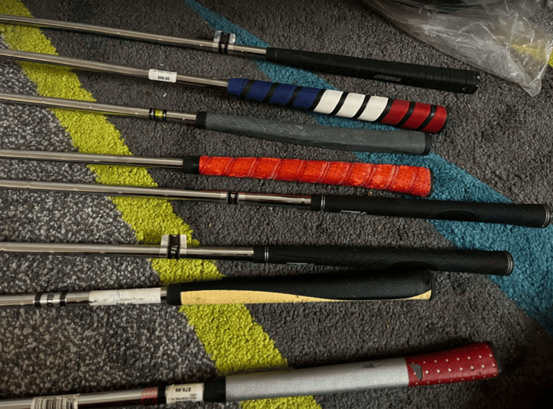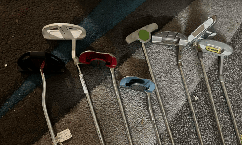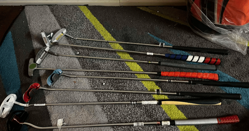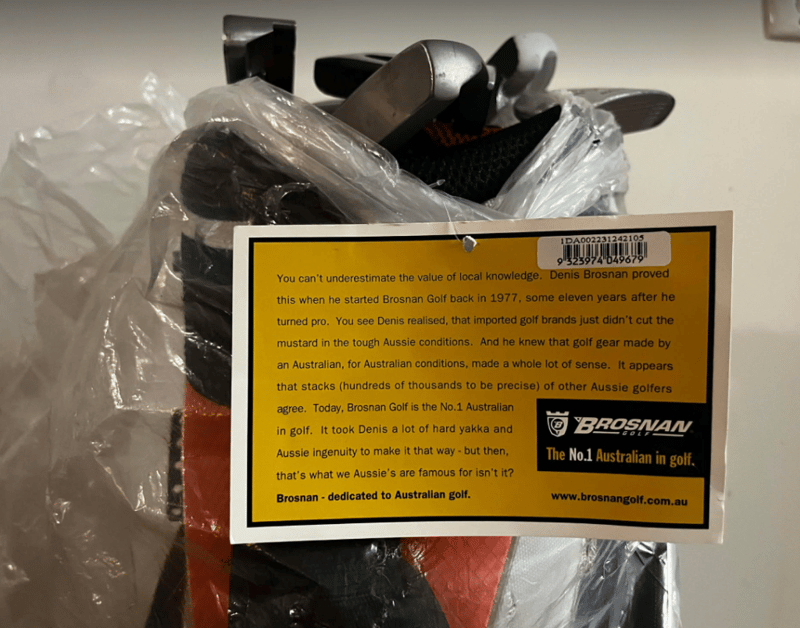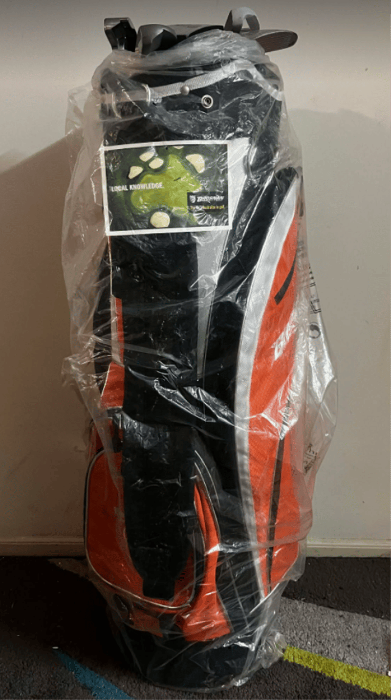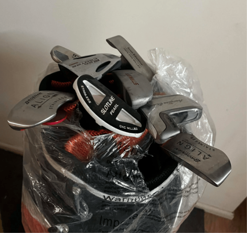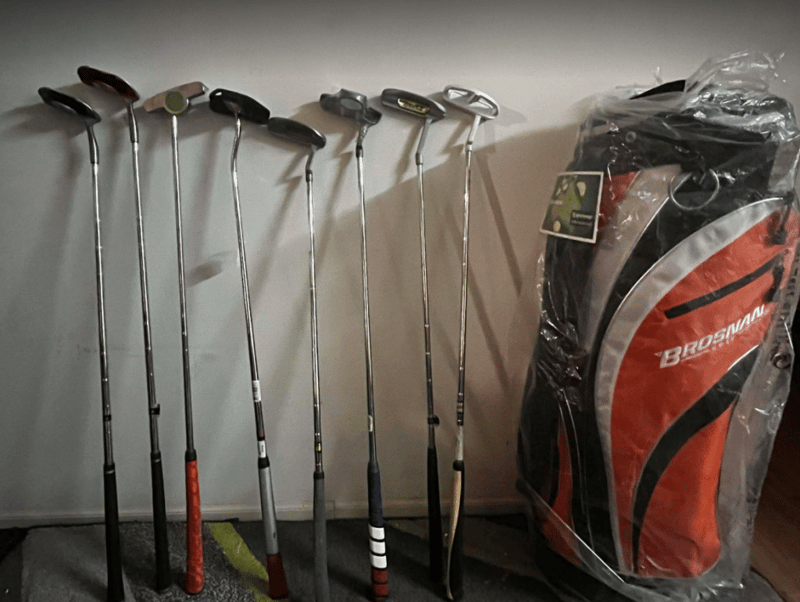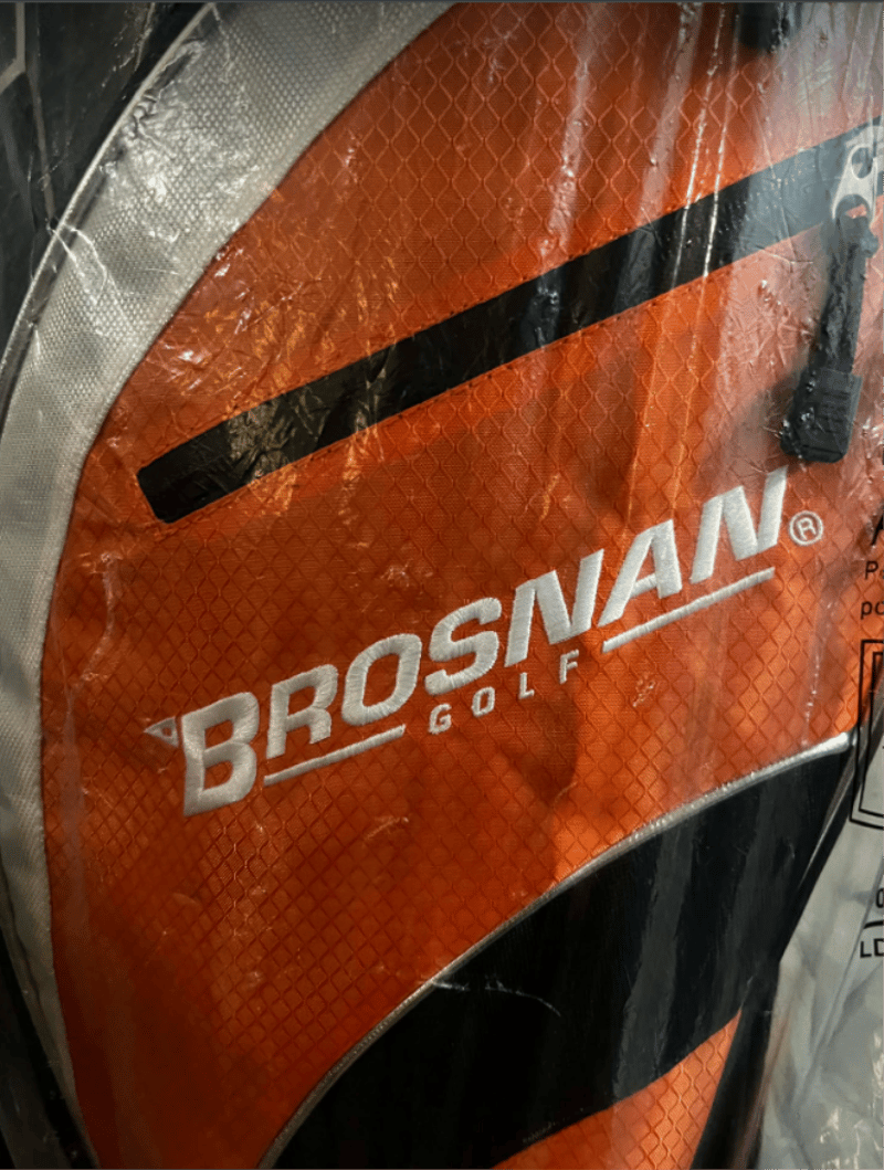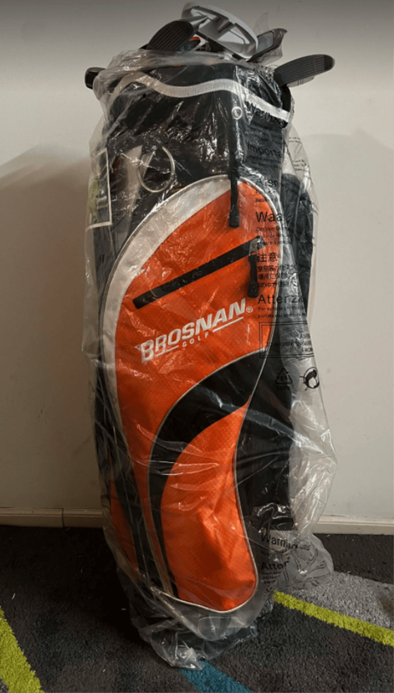 Brosnan Golf Pag wrapped in plastic (Orange/Black/White) With mixed brand Putters. Refer to Images