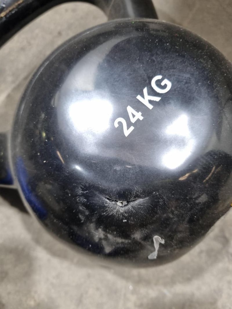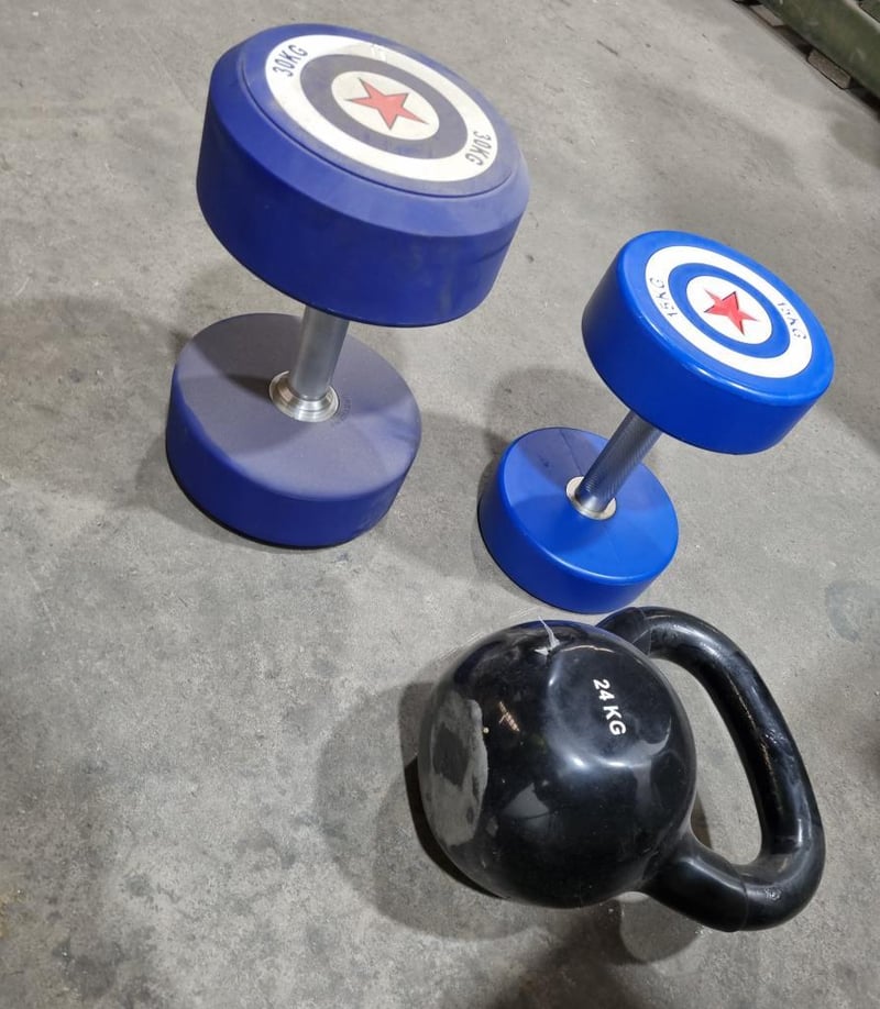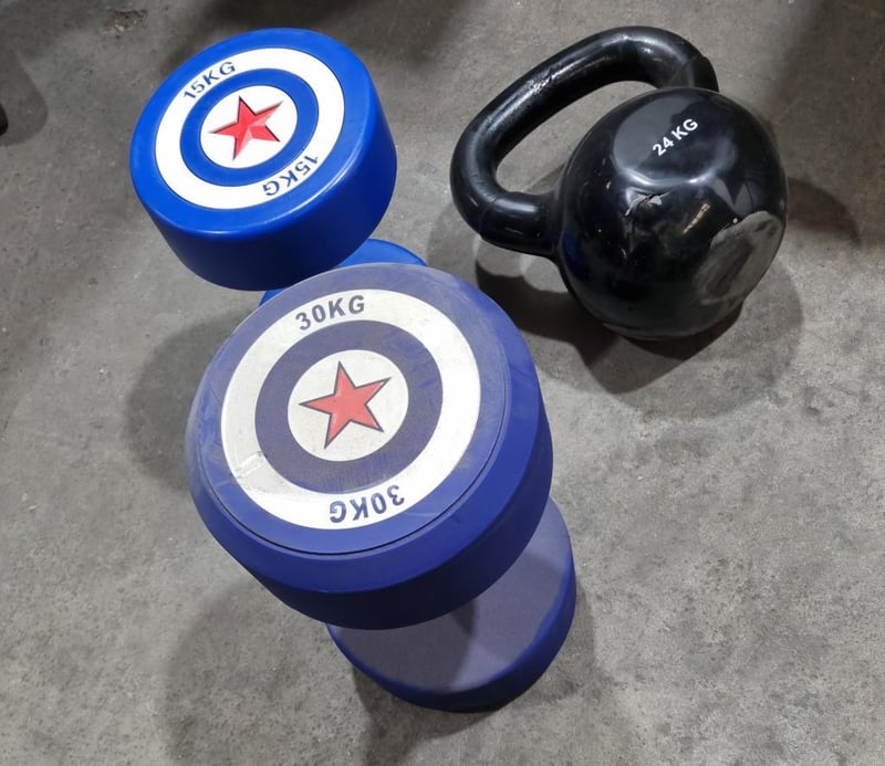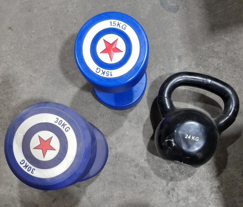 Assorted Dumbbell set, includes Captain America, 30kg and 15kg, plus Kettle Bell, black 24kgs. Sold as lot