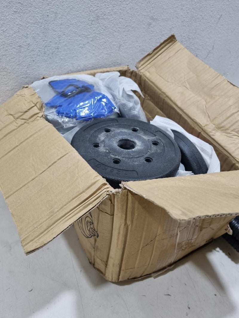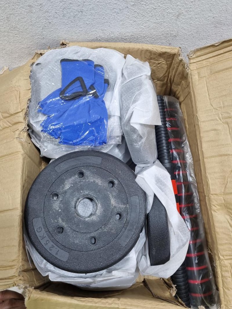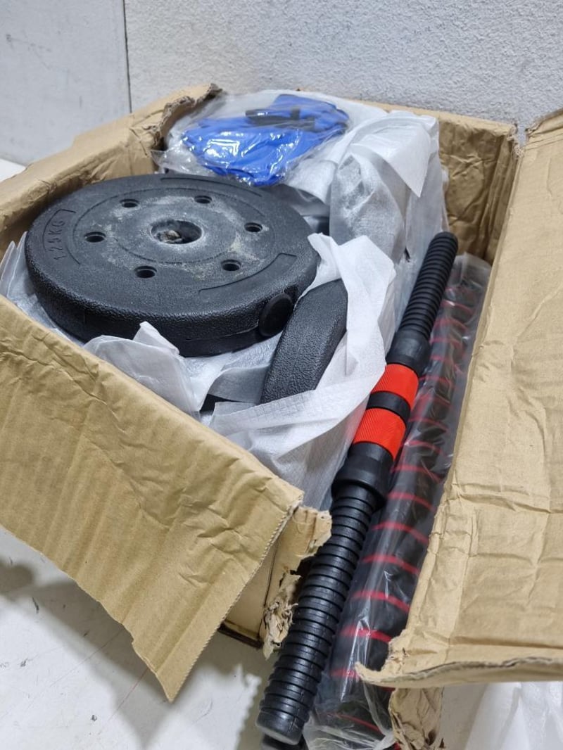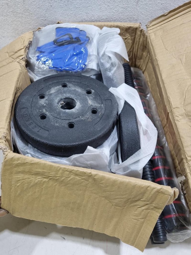 20KG dumbbell set. Includes, plates, gloves, and rods. Sold as lot