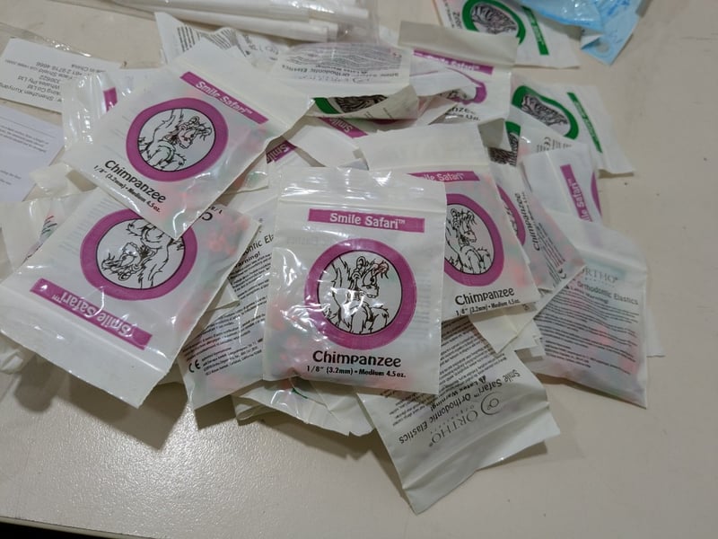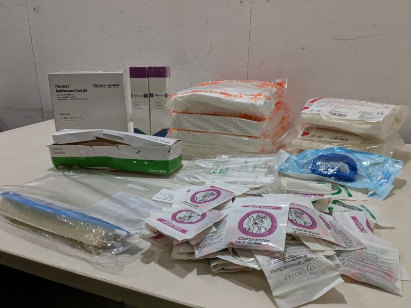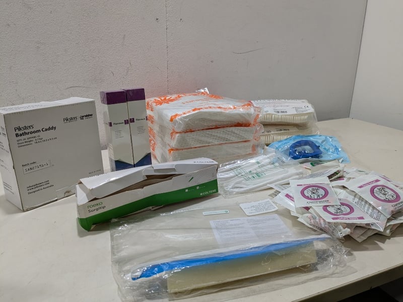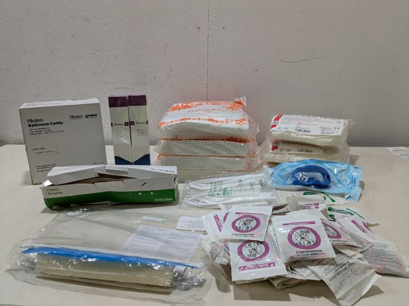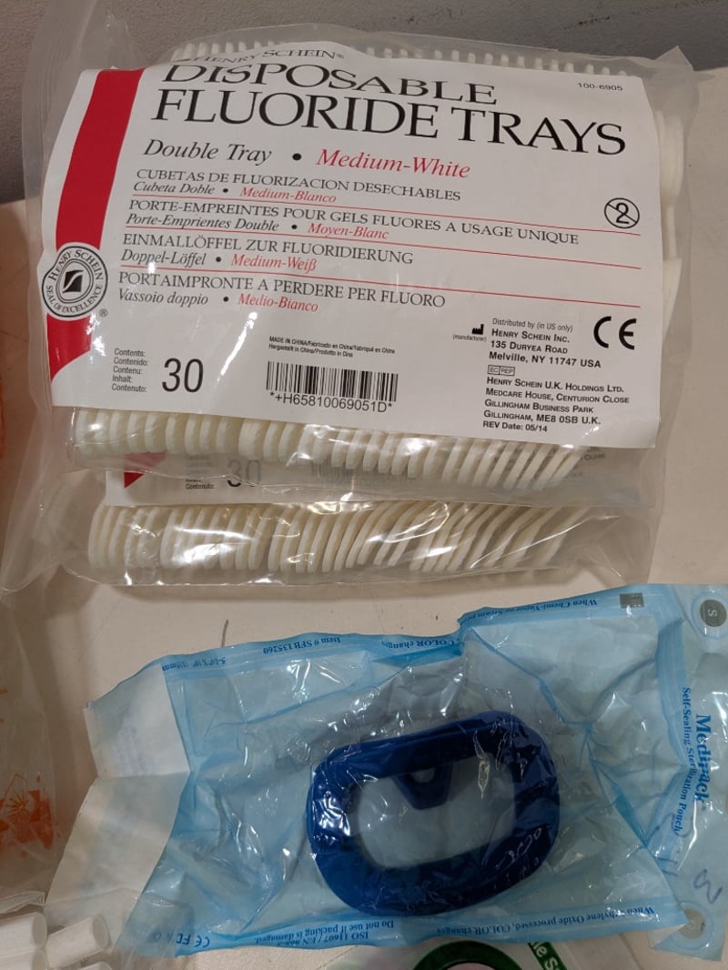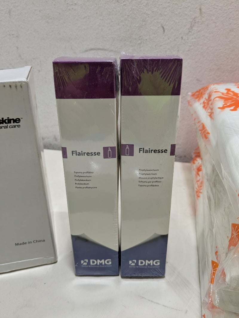 Assorted dental items include mousse prophylactique, halas bibs, and more... Sold as a lot.