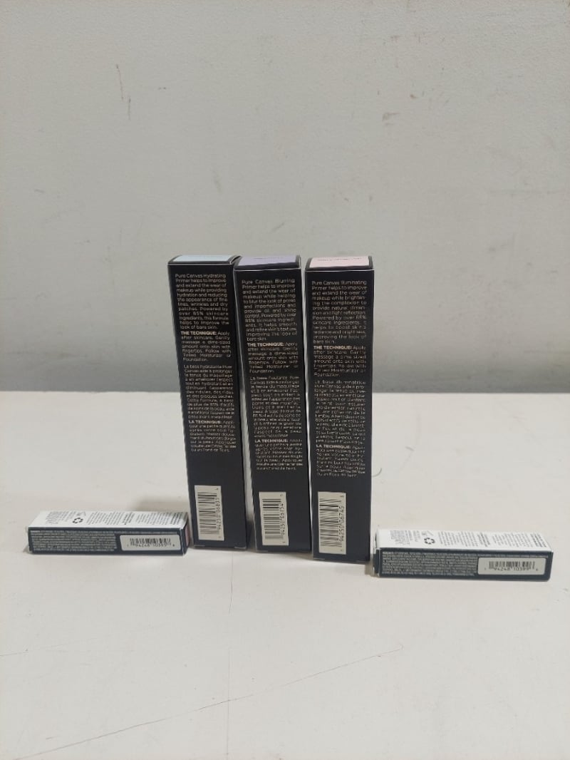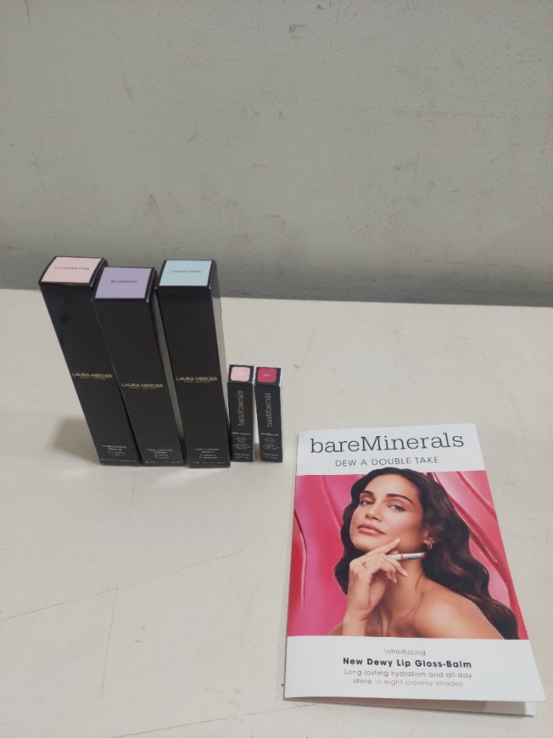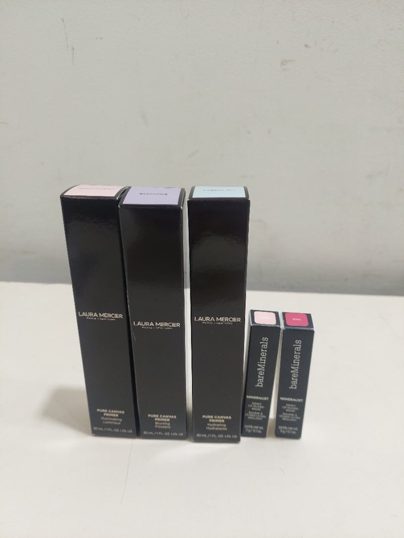 Several makeup products. Laura Mercier Pure Canvas Primers and bare Minerals lip glow balm. Sold as a lot.