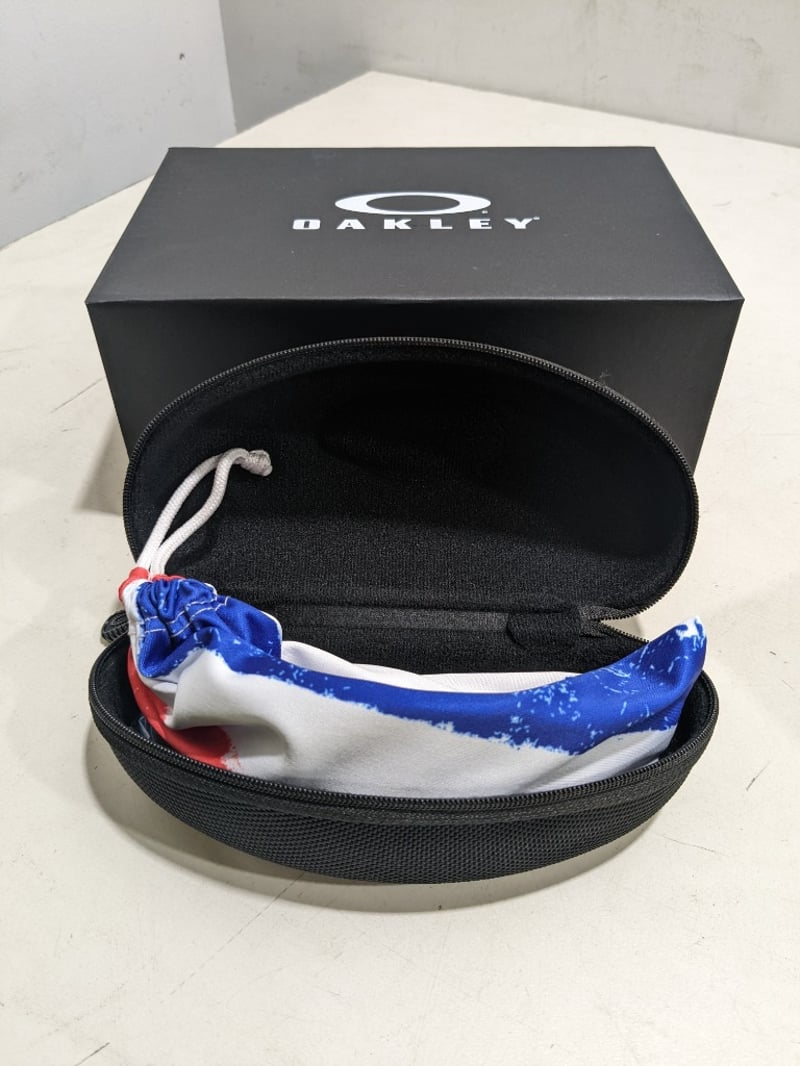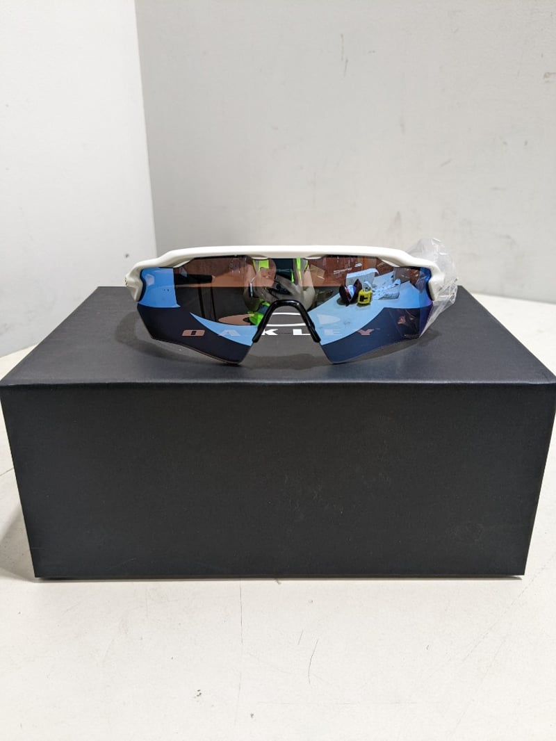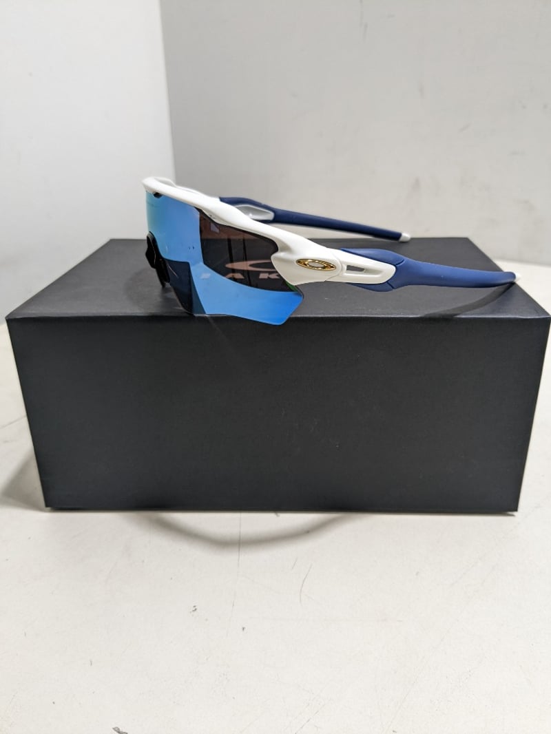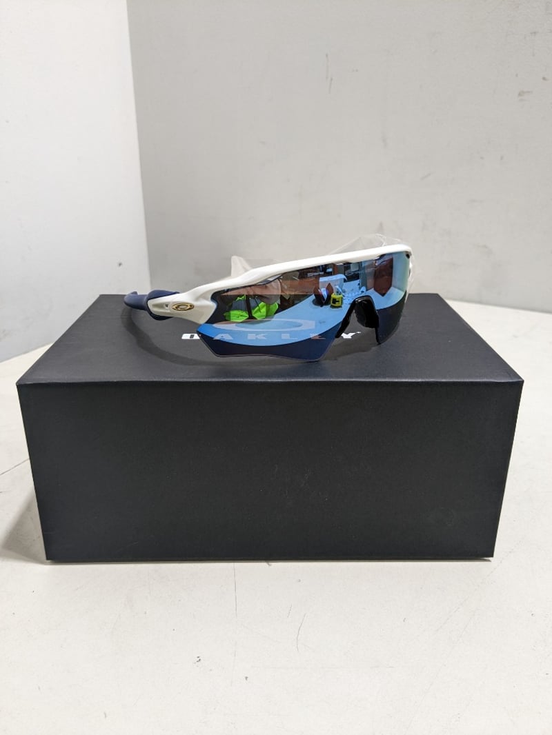 Pair of sunglasses with a Polished White frame and Prizm Sapphire lenses.