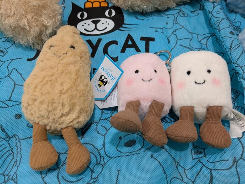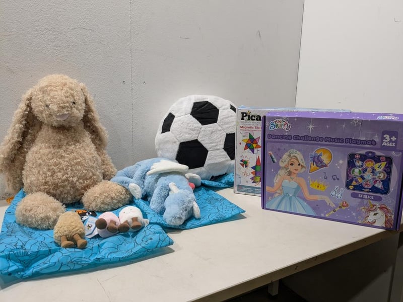 Assorted items include Jellycat London stuffed animals, dancing challenge playmat, and more...