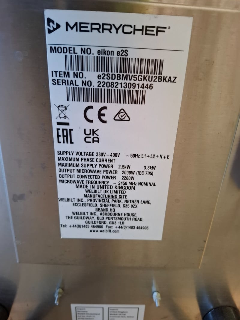 Speed ovenMake: Merrychef Model: E2SSerial: 2209213091246Dimensions: 35cm(W) x 69cm(D) x 64cm(H)Description/Extras: 3 phase, 20 Amp, black, includes accessories