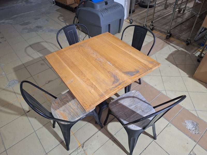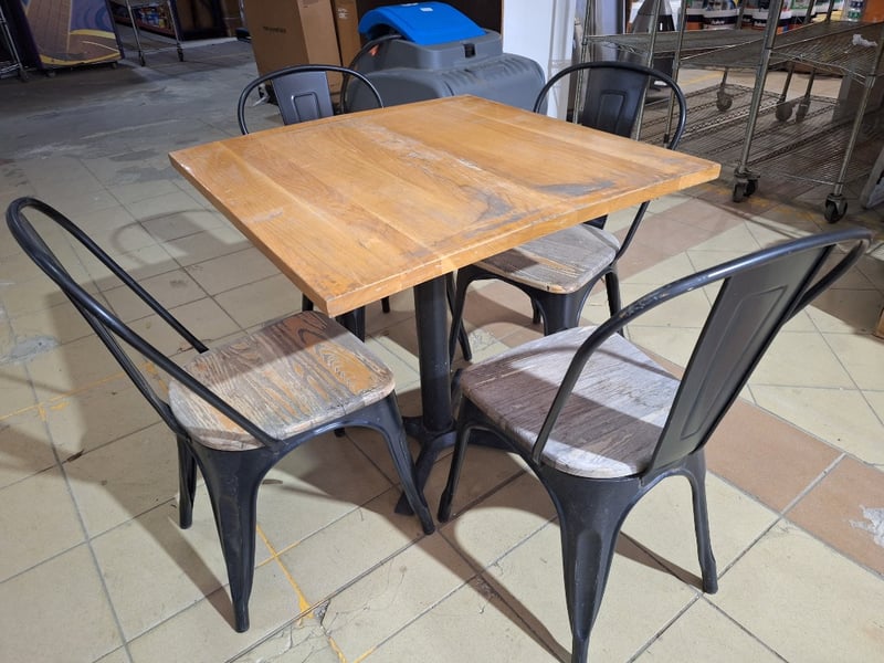 Event 4-Seater Table & Chairs, Timber & Metal Style, Brown & Black FinishDimensions Table H:75cm W:80cm D:80cmDimensions Chair H:83cm W:45cm D:38cmSOLD AS LOT