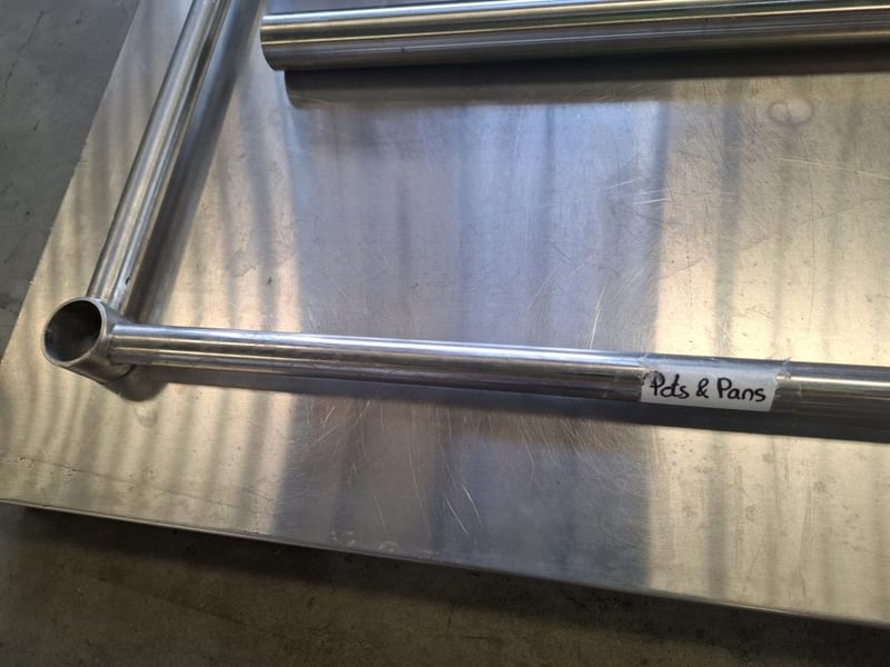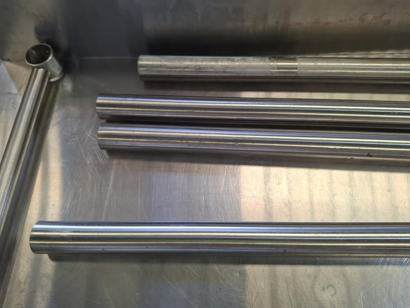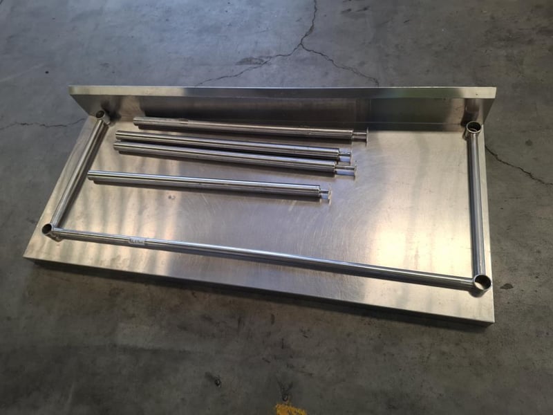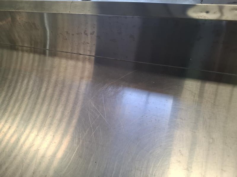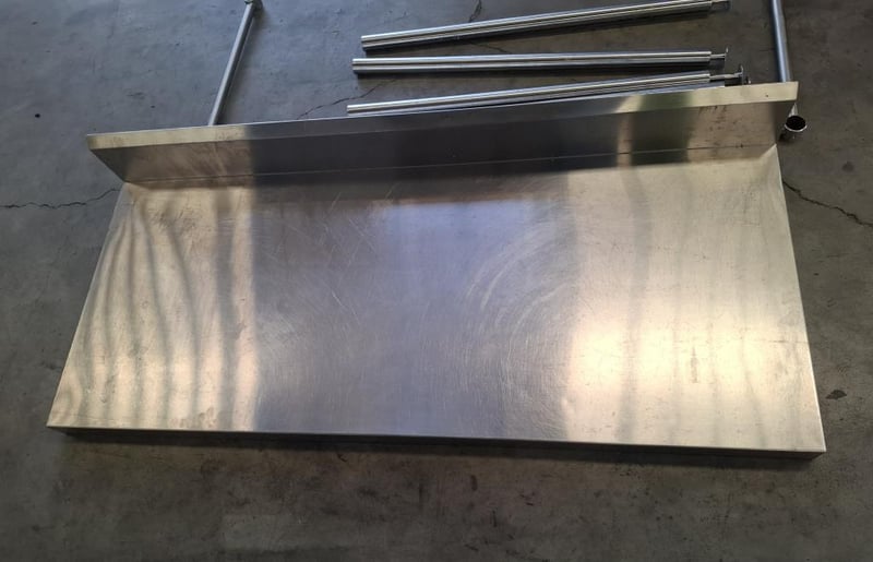 Vouge Stainless Steel Bench with Splashback has scratches and dents. Dimensions: W 150 x D 65 x H 90 cm