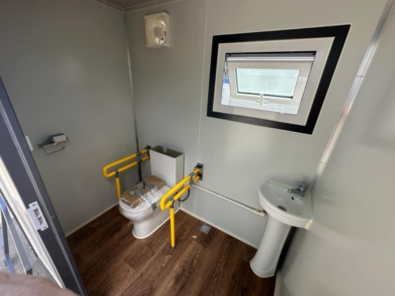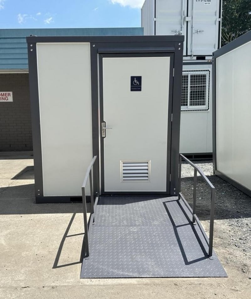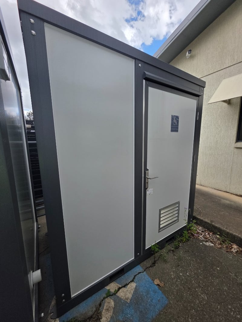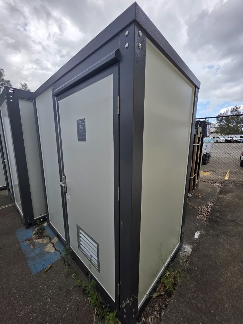Disable Toilet Block FEATURES: - Toilet - Sink - Window - Ramp - Lockable - Lights - Extractor Fan/Vents Dimensions: H2360mm x W2160mm x Ramp Length 2320mm Weight Approx 500kgs Note: Unable to unlock door, seems stuck. Photos of interior from a different block. Location: Acacia Ridge, QLD NOTE: Branch will be closed for the Christmas period from Thursday 25th of December to Monday 5th of January