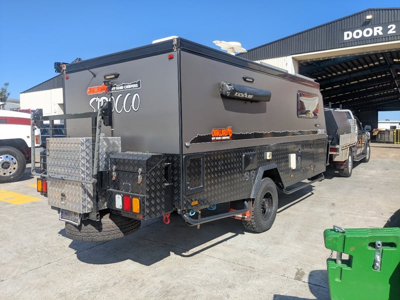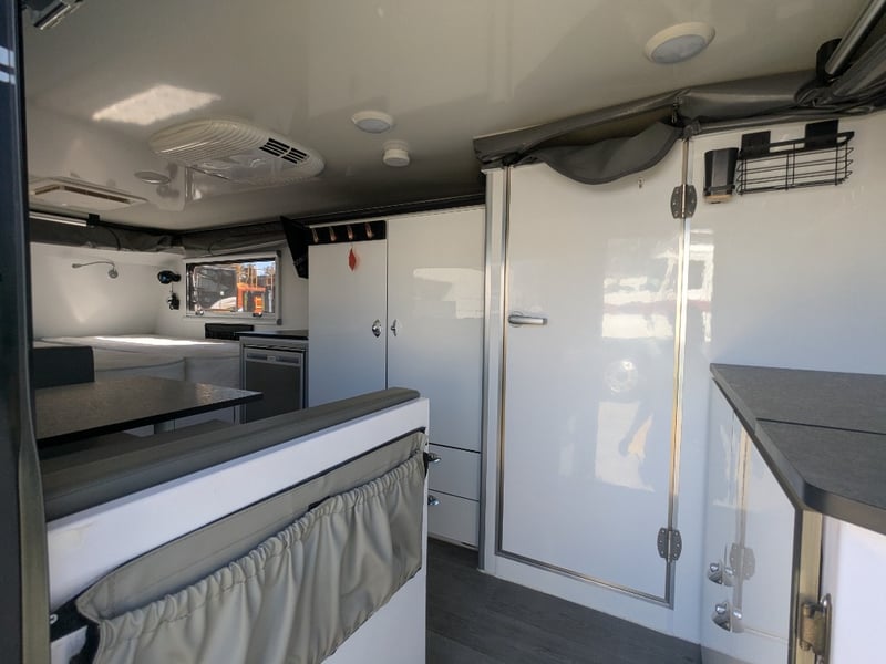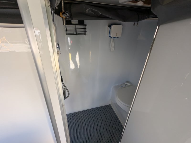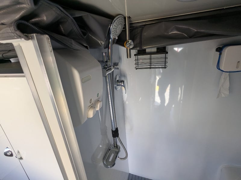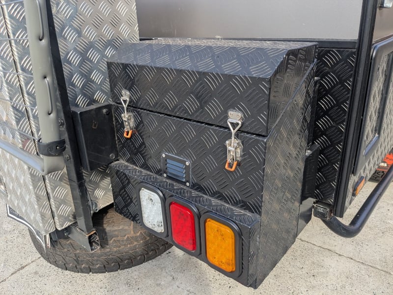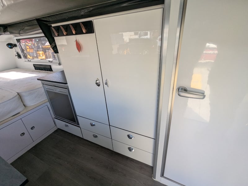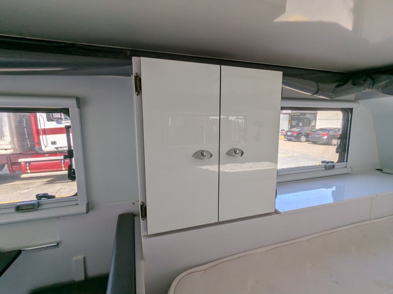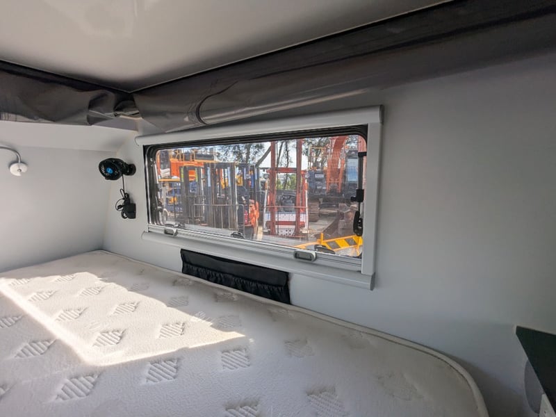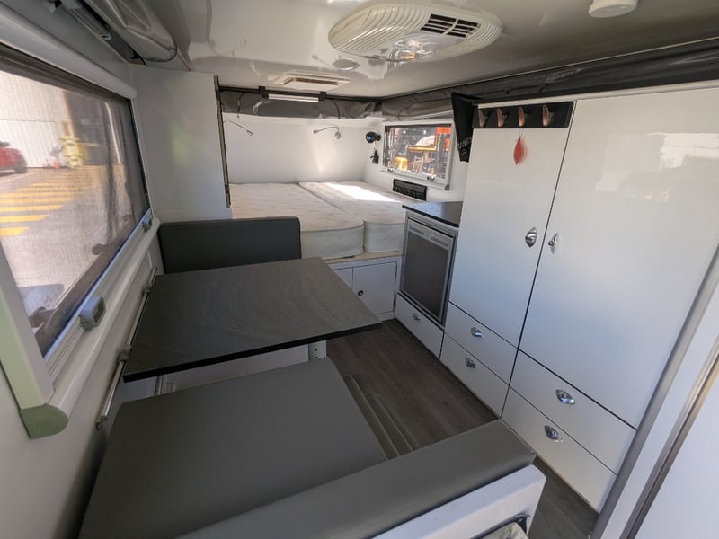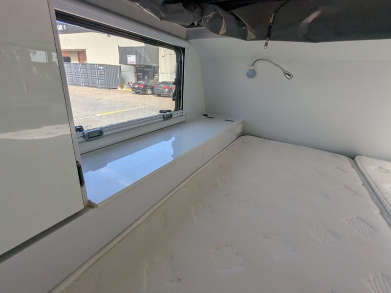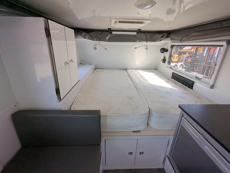 Description/ extras: Water Heater, Shower, Toilet, Sink, Tv, Speakers - In/Out, Fan, Fire Extinguisher, Under bed storage, Full Length Awning, Clothes Line, Exterior lights, Full power control, AirCon, Stereo (Radio or Bluetooth), Dual Gas bottles, Solar Panels, Expandable roof height, Power Points