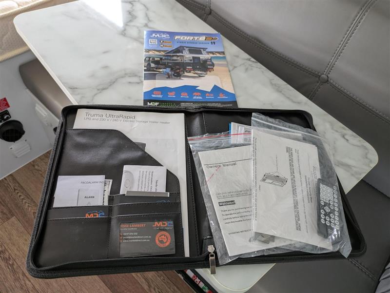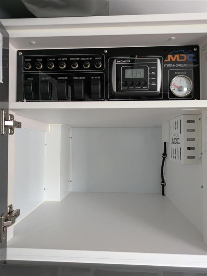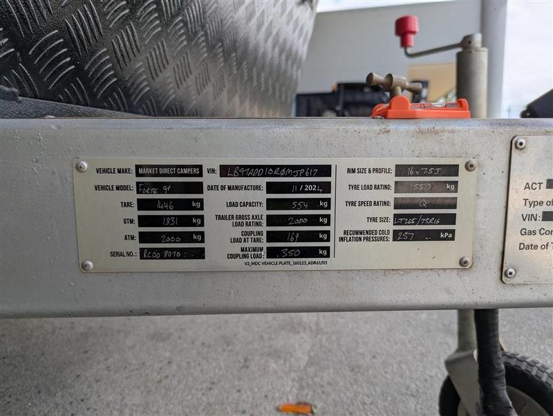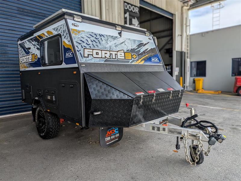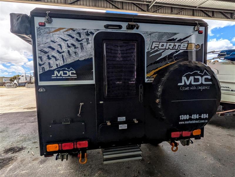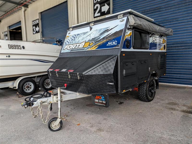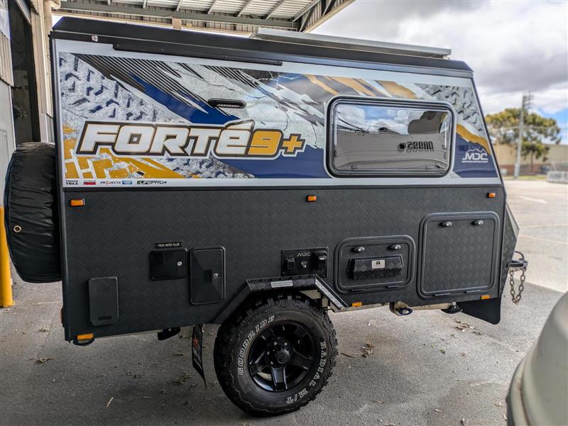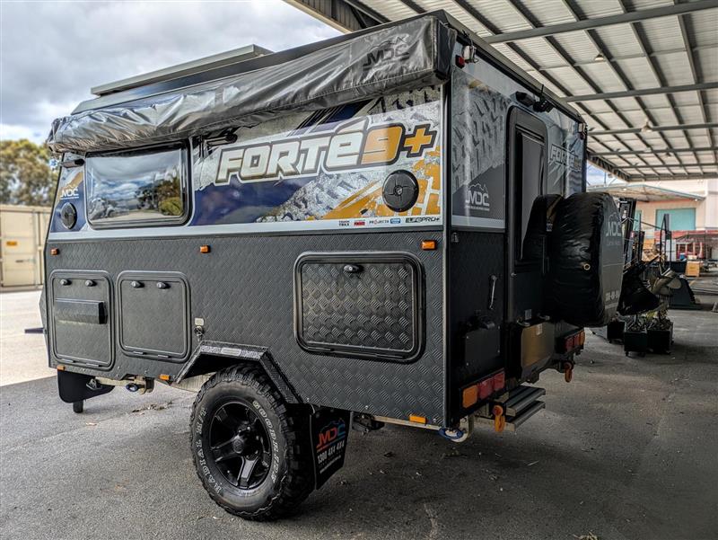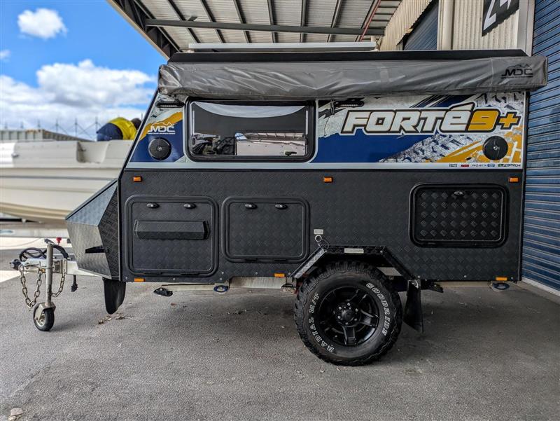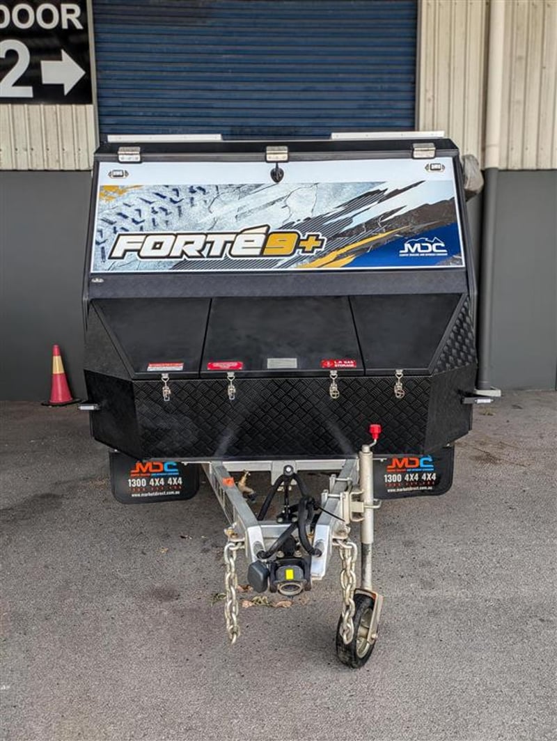 2024 MDC Forte 9+ off-road camper trailer. Features include external fresh water filler, lockable external shower, TV and power inlets, external battery compartment, and certified gas installation (tested 19/11/2024). Interior includes a fixed double bed, lounge seating with storage, integrated cabinetry, Projecta control panel, inverter, and fire extinguisher. Reversing camera system, multiple power points, and TV mount. Presents in near-new condition with minimal to no wear but faded checkerplate.