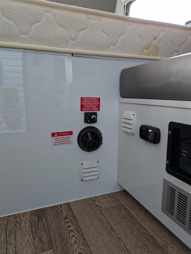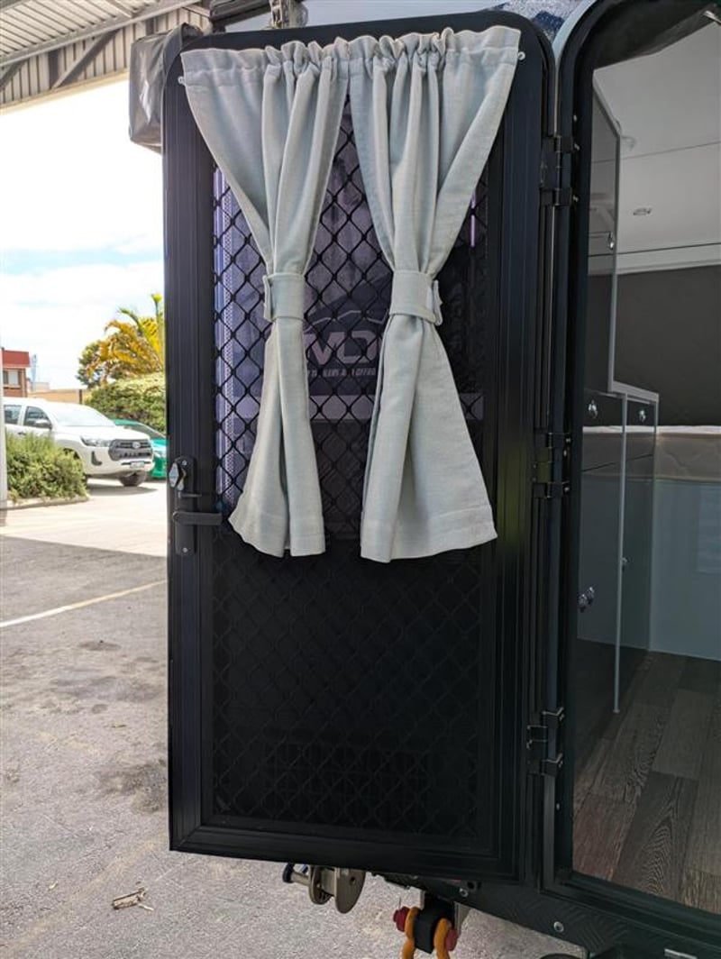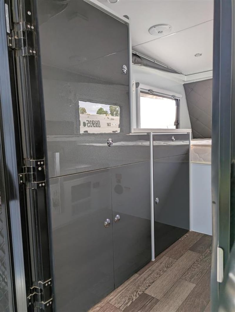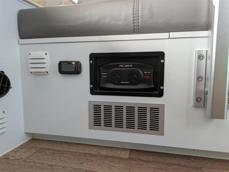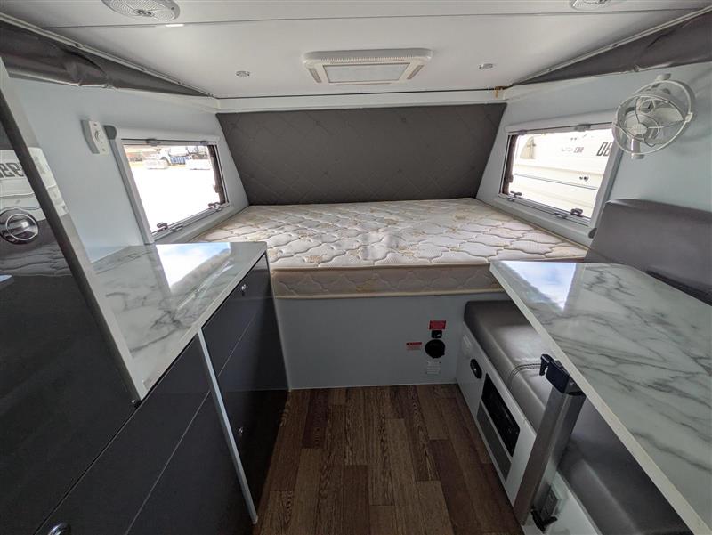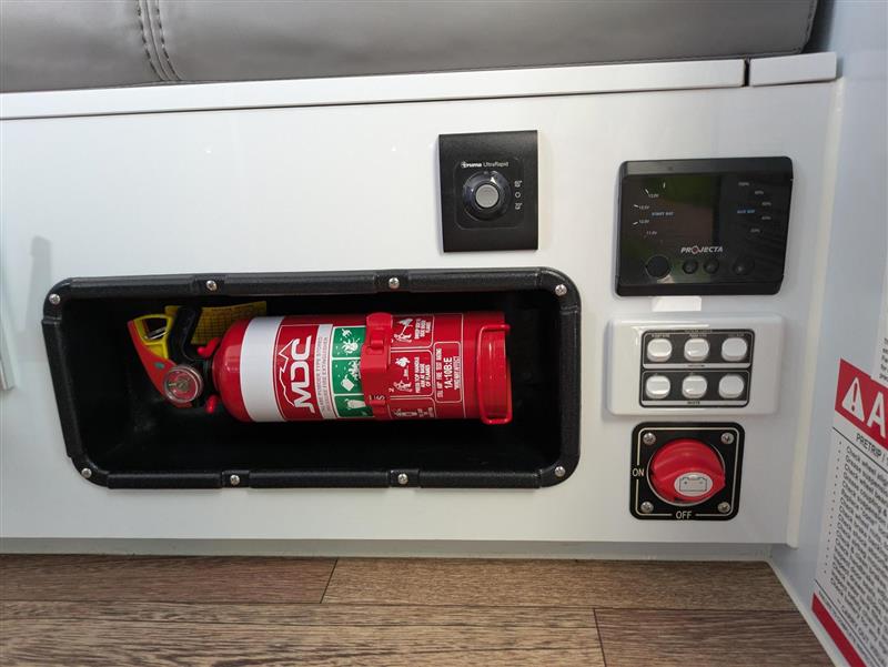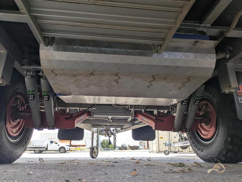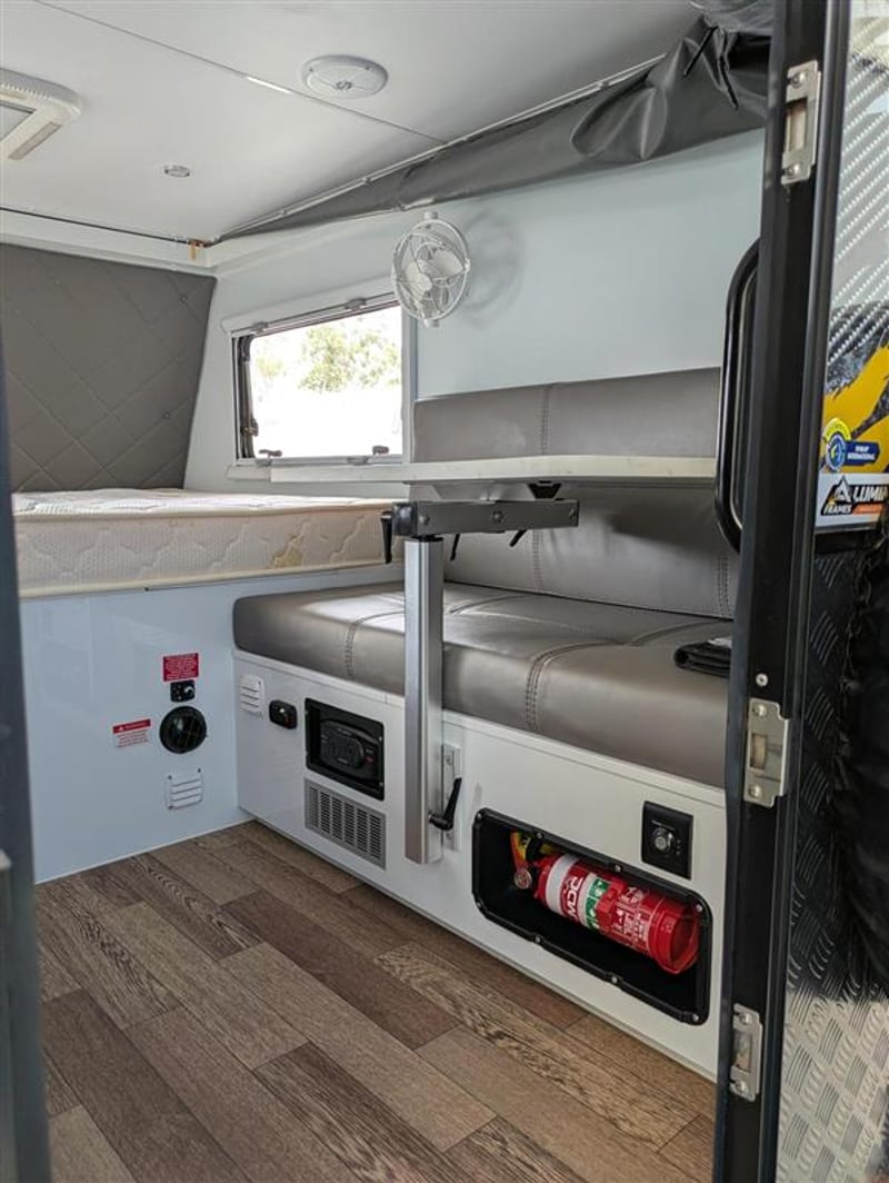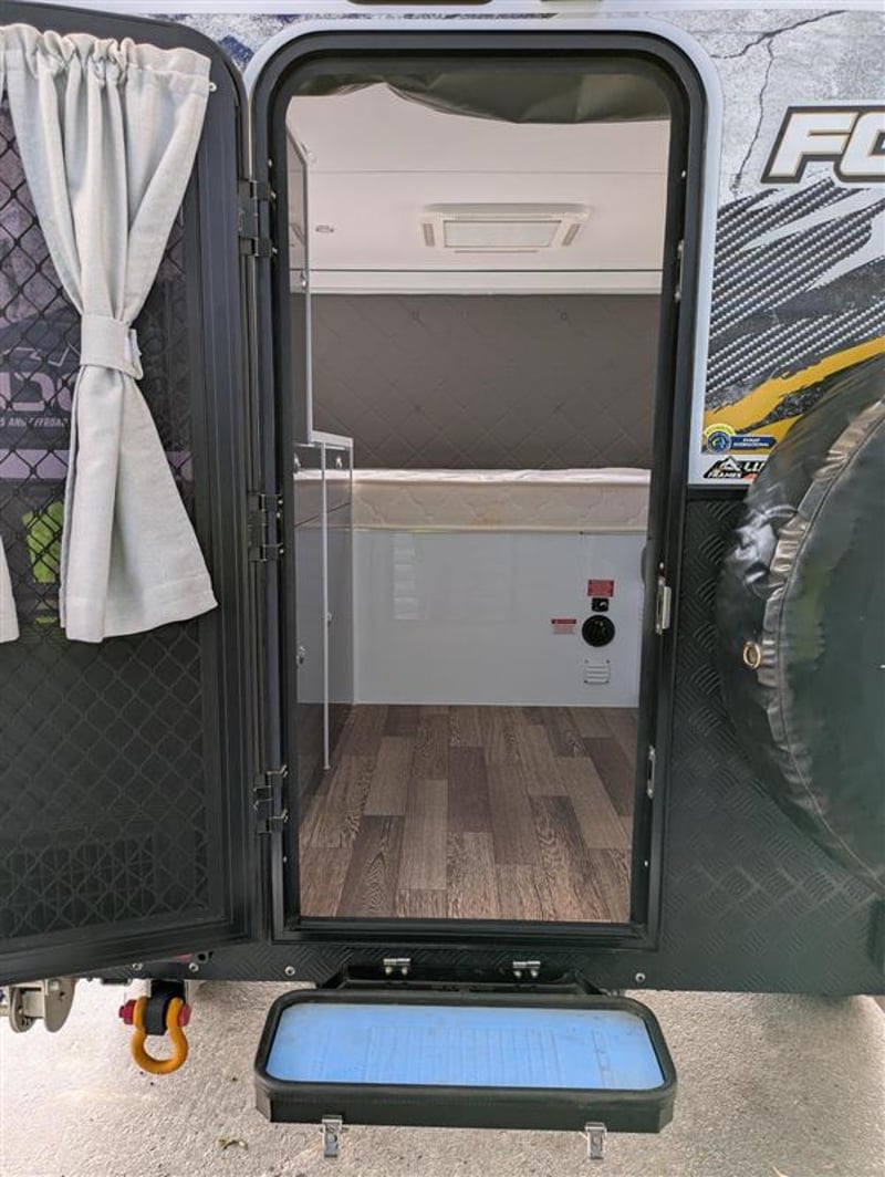 2024 MDC Forte 9+ off-road camper trailer. Features include external fresh water filler, lockable external shower, TV and power inlets, external battery compartment, and certified gas installation (tested 19/11/2024). Interior includes a fixed double bed, lounge seating with storage, integrated cabinetry, Projecta control panel, inverter, and fire extinguisher. Reversing camera system, multiple power points, and TV mount. Presents in near-new condition with minimal to no wear but faded checkerplate.