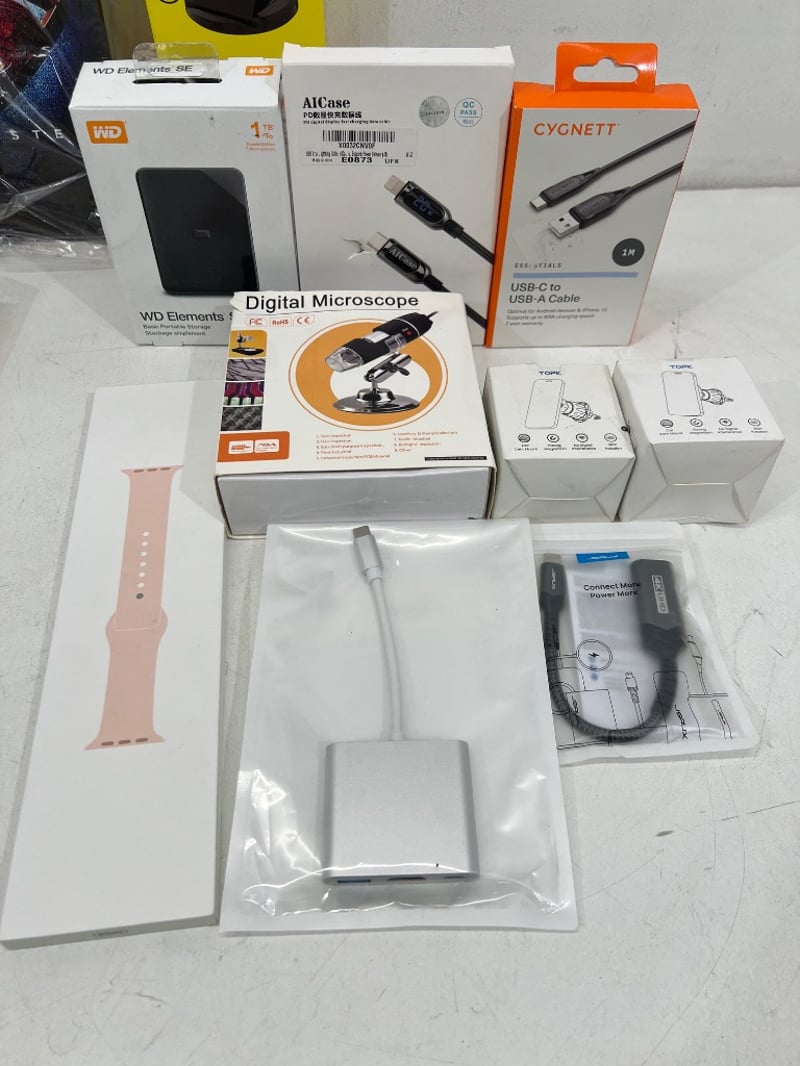 Assorted tech accessories, includes; iPad cases, watch band, cables, etc