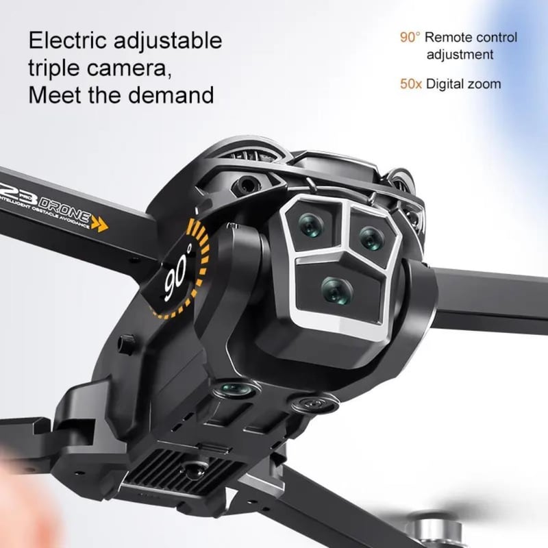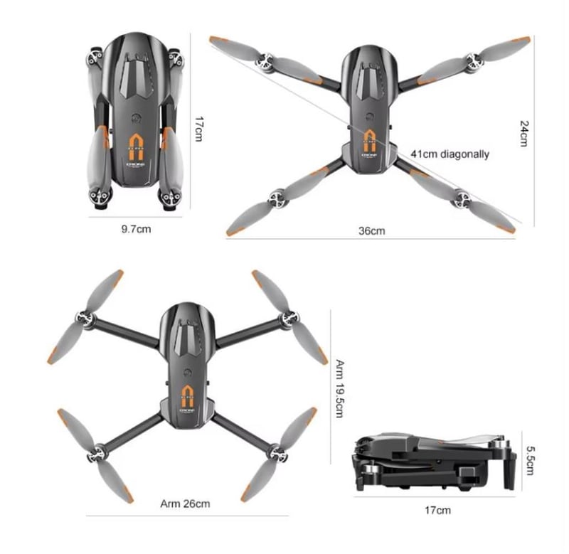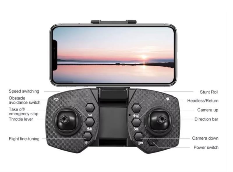FPV Quadcopter Drone Dual HD Cameras FPV Mobile Phone APP View & Control Remote HD Front Camera & HD Bottom Camera(Front Camera has 3 Lenses for Multiple Angle Shooting) and Improved Image Quality 1 Key Landing and Take-off Auto Hover Control Front Camera Manual Adjustment 2.4GHZ Wi-Fi 4 Channel 20cm x 16cm unfolded 3Way Automatic 360 Degree Obstacle Avoidance Auto Trajectory Flying 3D Flip Approx 150 Metre Drone Control Spare Blades Zipper Close Storage Bag One-Key Take-off and Landing 360-degree Hover Mode LED Flying Lights Long Fly Time EXTRA DRONE BATTERY FOR EXTENDED USE. Batteries for remote not included (NEW IN BOX) BLACK