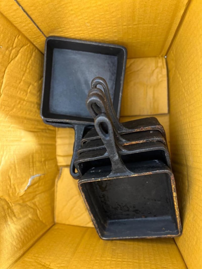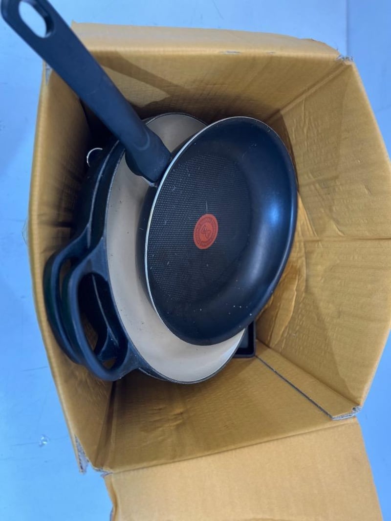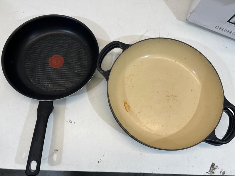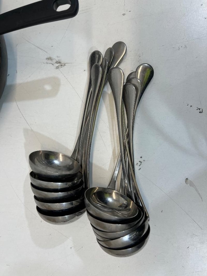 Assorted kitchen equipment, unknown brand/ model, includes; pans, ladles, cast iron dish Sold as lot