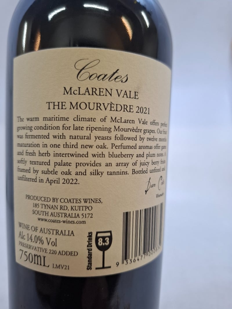 12 x Bottles Of Coates 2021 The Mourvedre McLaren Vale, South Australia, 750ml, 14% Alc/vol