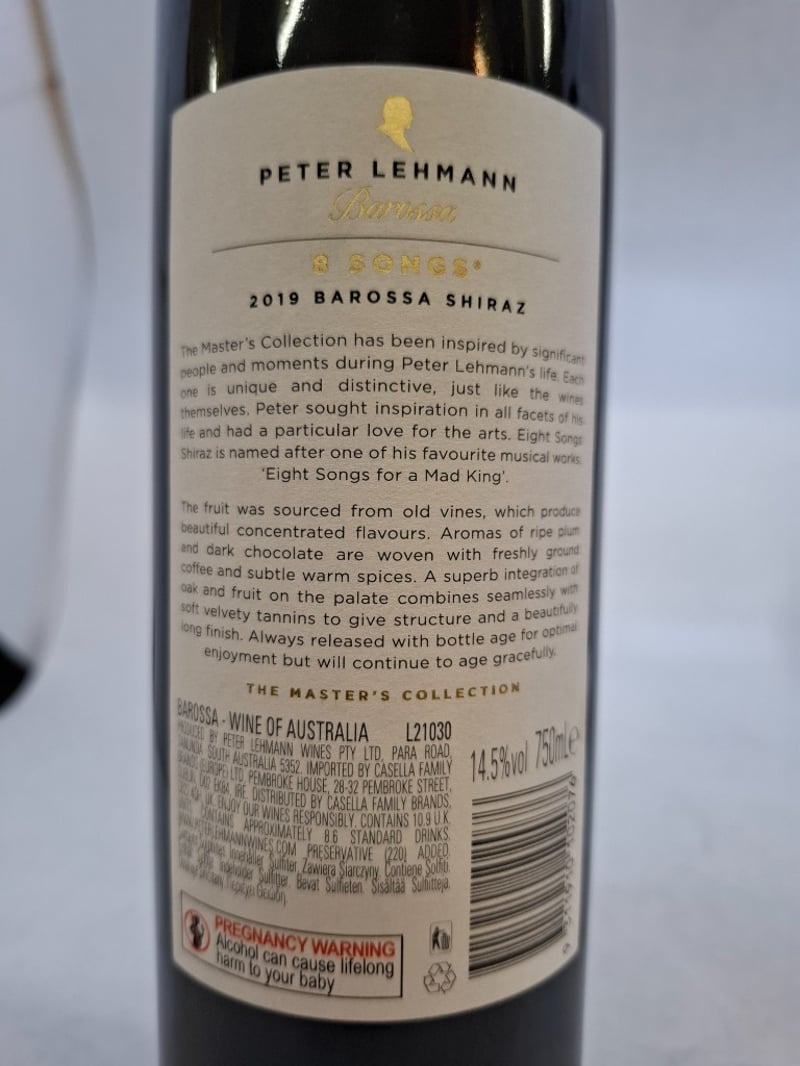 6 x Bottles Of Peter Lehmann Barossa 2019, 8 Songs Shiraz, Australia, 750ml, 14.5% Alc/vol