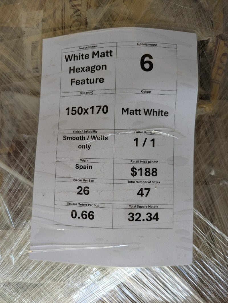 Wall Tiles, White Matt Hexagon Feature, Matt White Colour, Smooth, Spain Origin, Approximate Quantity of 1222 Tiles (32.34 Square Meters)