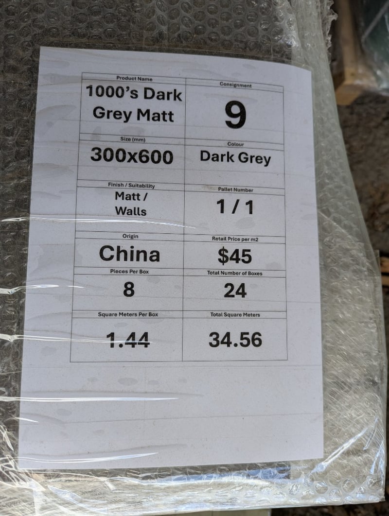Wall Tiles, 1000's Dark Grey Matt, Dark Grey Colour, Matt, China Origin, Approximate Quantity of 192 Tiles (34.56 Square Meters)Approximate Dimensions: 300mm x 600mmSOLD AS LOT